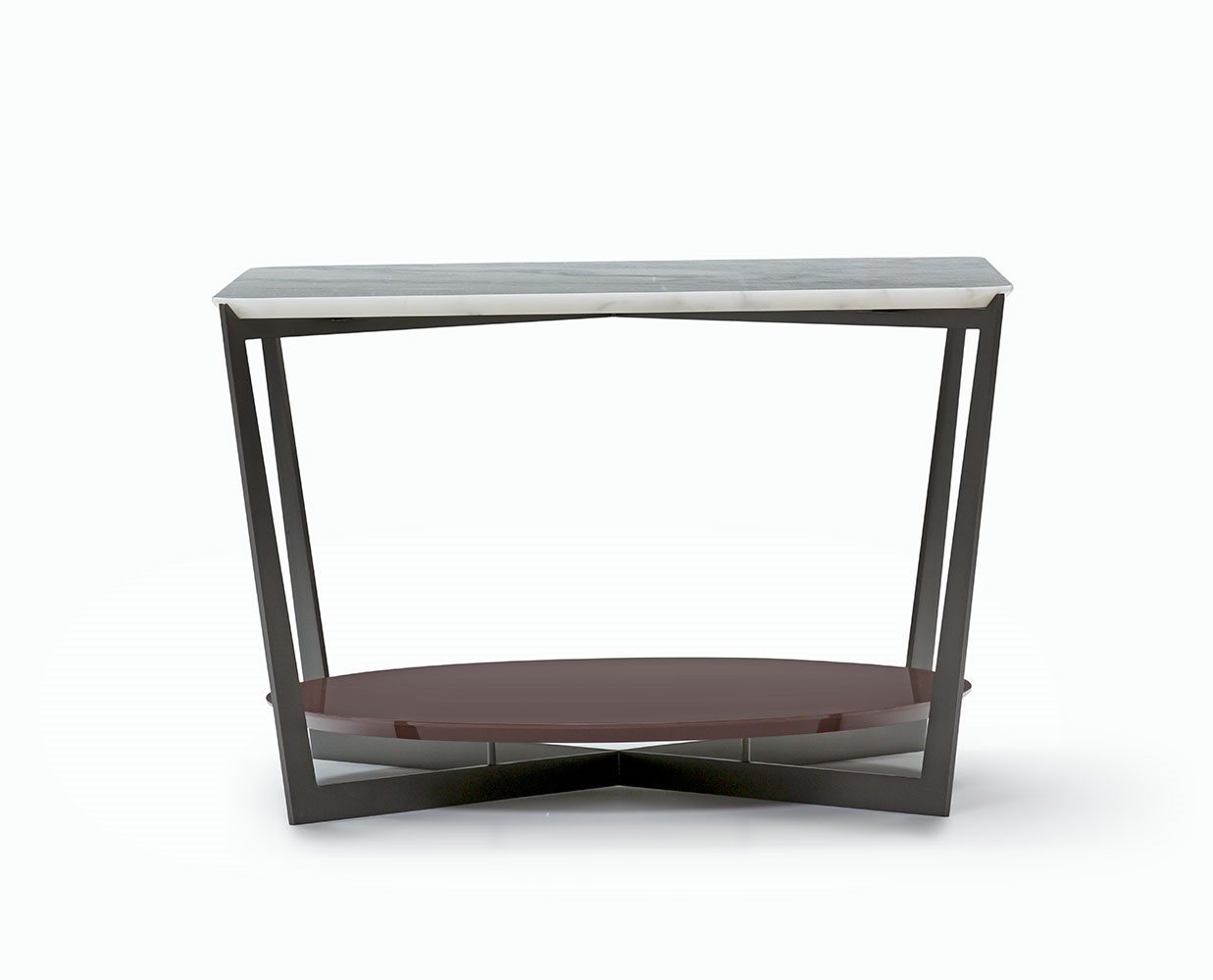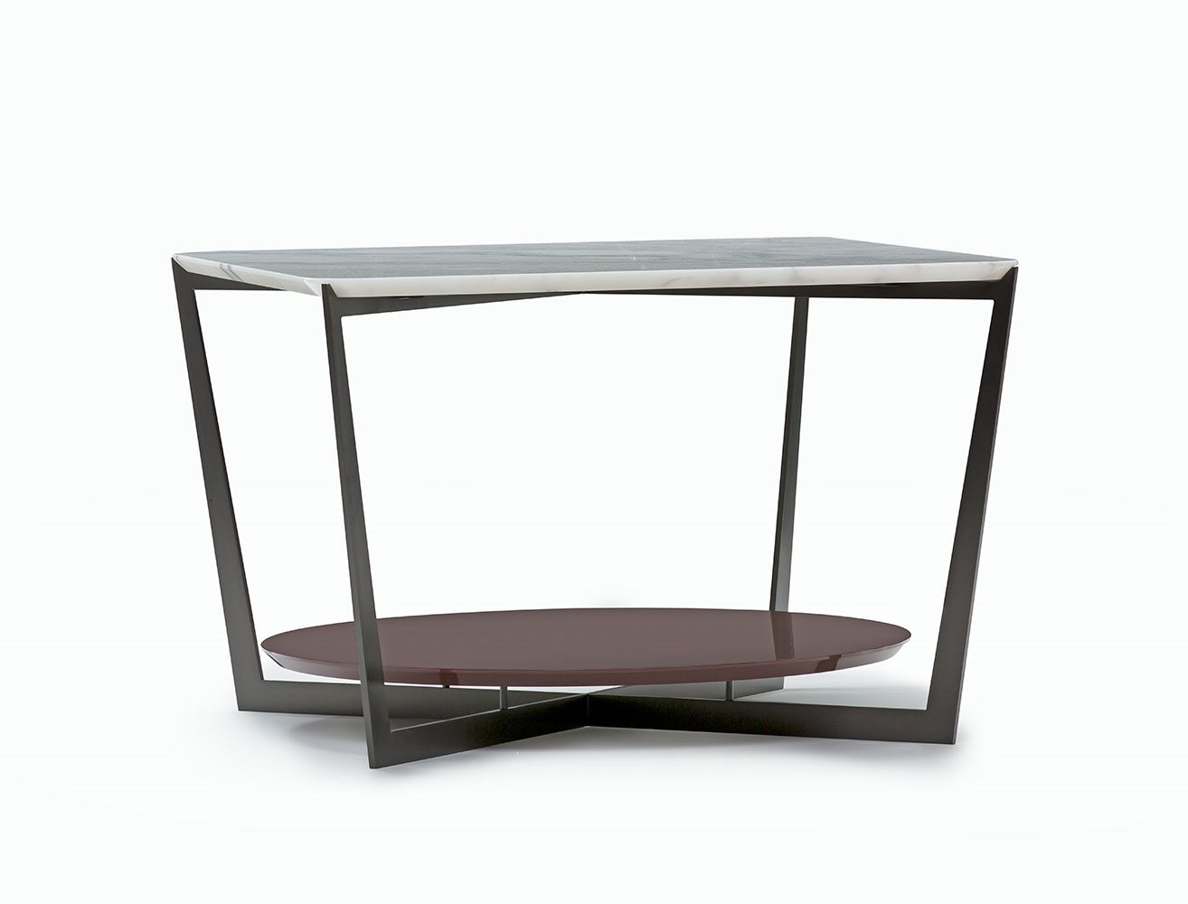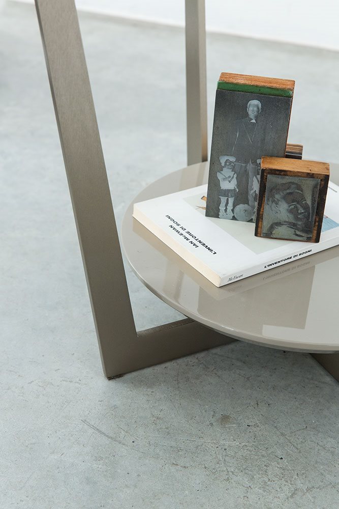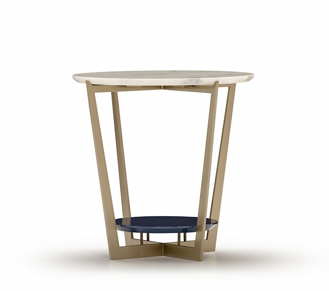 Small tables. Structure: in metal. Structure finishing: French Bronze or Gun Metal. Top high (1): marble. Top low (2): MDF. Top low finishing (2): lacquered.