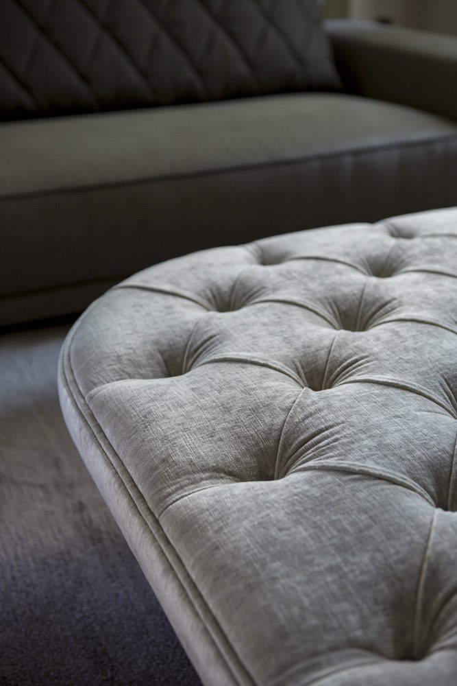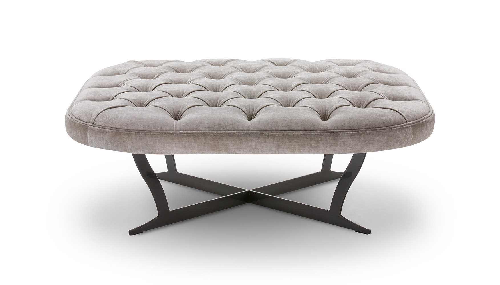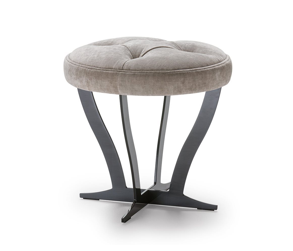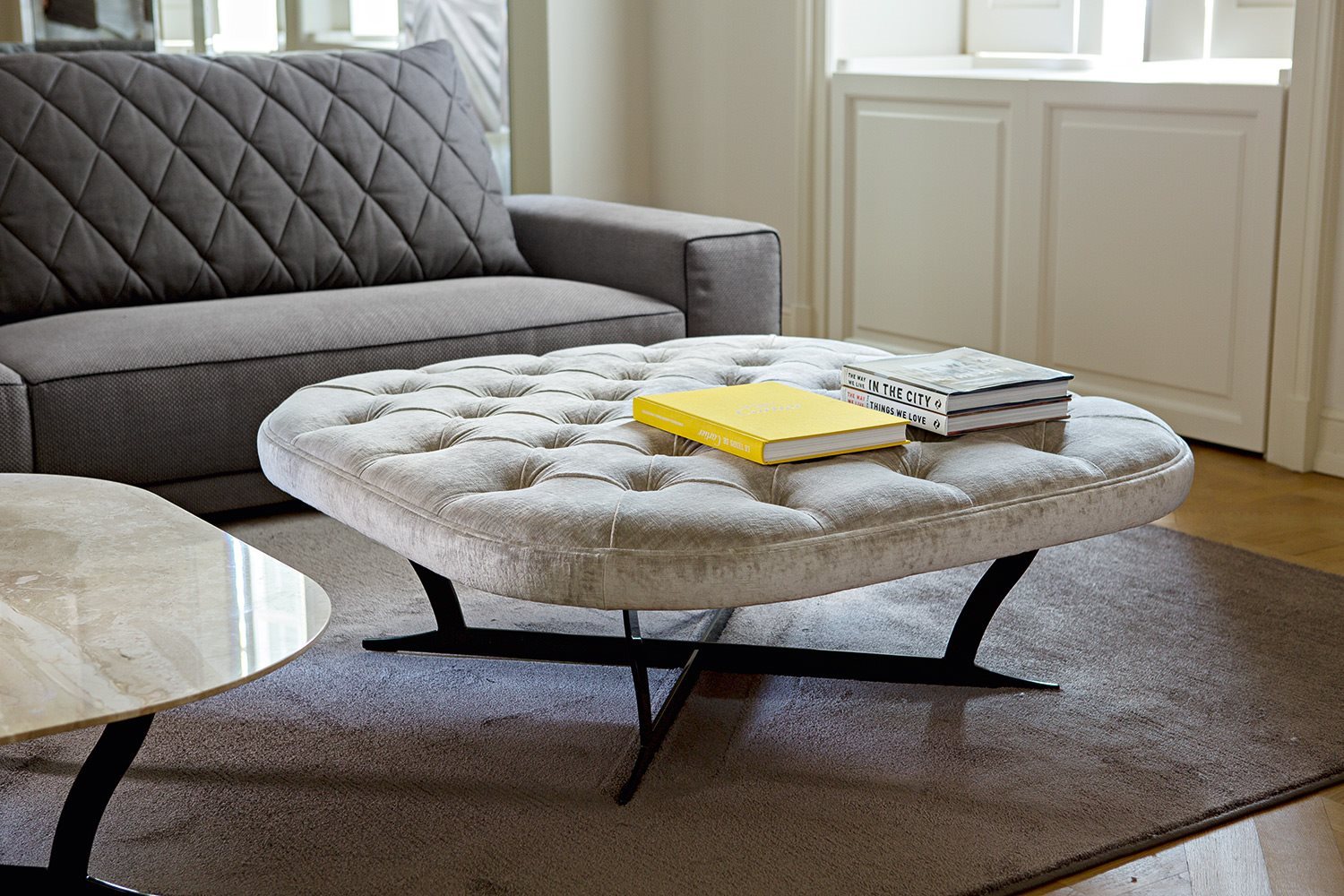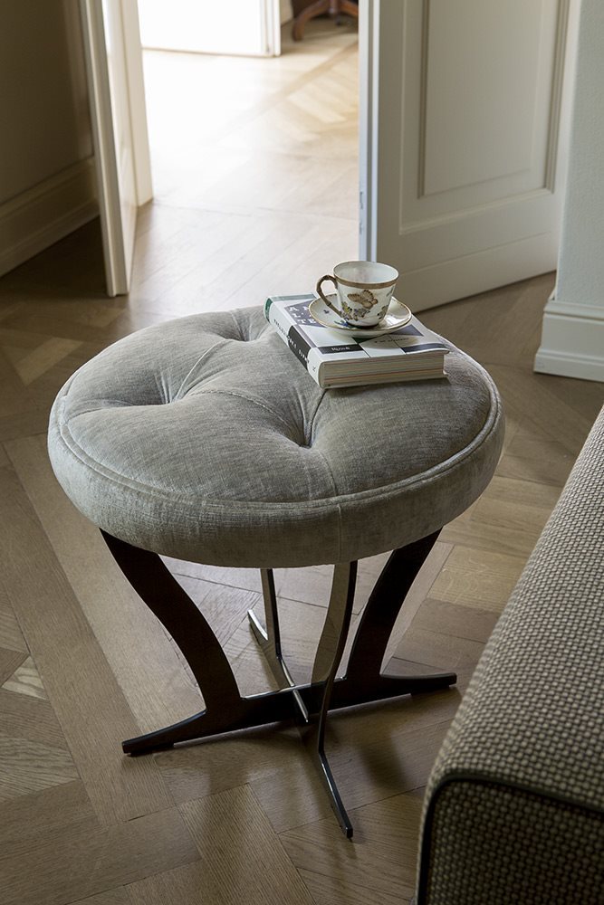 Modern interpretation of the classic quilted for the seat, metal for the base, upholstered small tables RICHARD (round and square) are at the same time a small seat and a practical top which supports the sofa. Top in fabric and metal base – finishing options: COPPER, BRONZE, BROWNED.