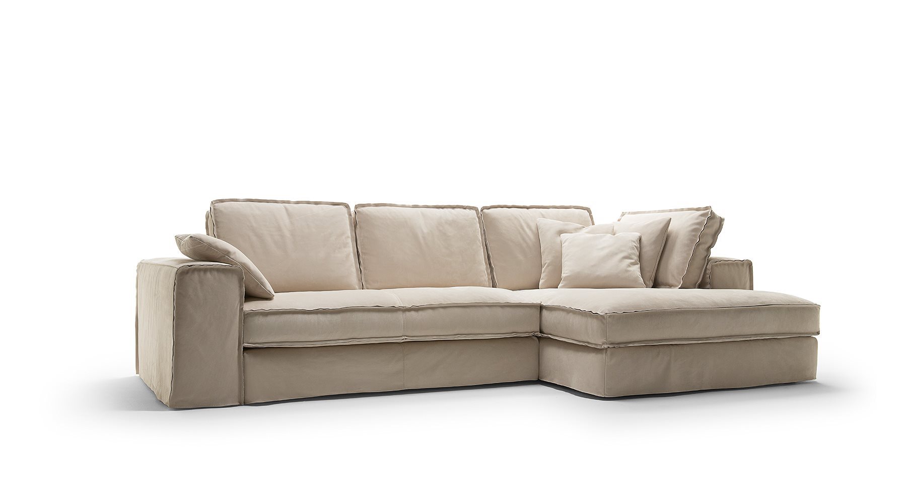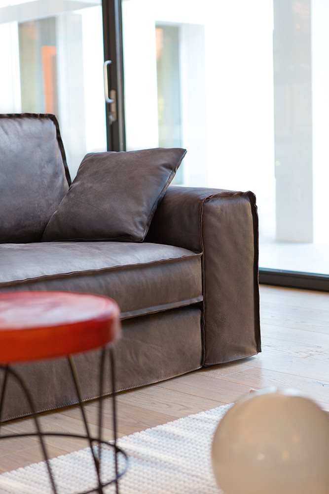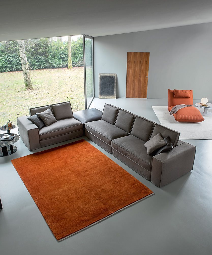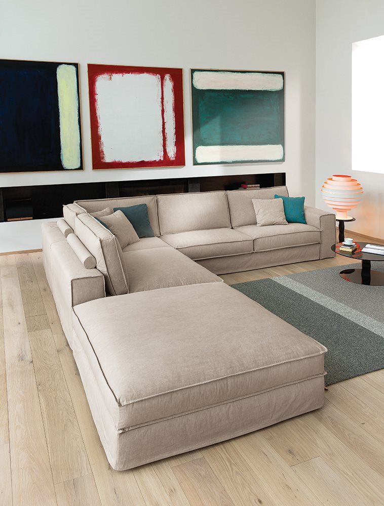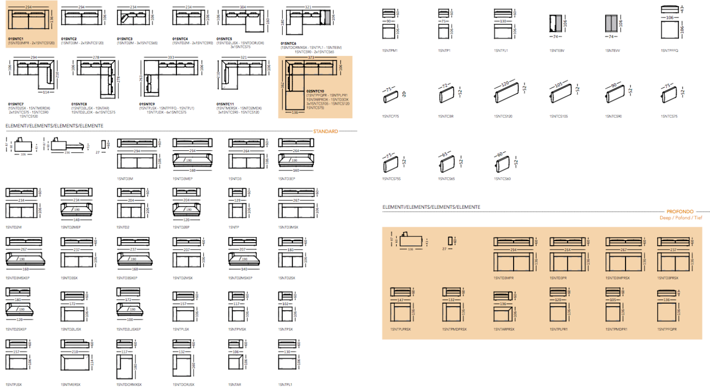Fabric and leather covers. Model Santorini represents the modern evolution of the traditional sofa concept. Essential shapes are combined with the search for the maximum comfort; customization options thanks to backrest cushions of different sizes. Back cushion in polyurethane foam with upper part in goose feathers. Seat cushion in polyurethane foam with goose feathers and polyesther fiber padding. Chassis in polyurethane foam with different densities. The range of elements is very wide and includes sofas with two arms and sectional elements (also deeper elements). The sofas with standard depth can be equipped with electrically-welded spring and polyurethane foam mattress. These features gives the model a great versatility, making it suitable to satisfy the different needs of the users.
