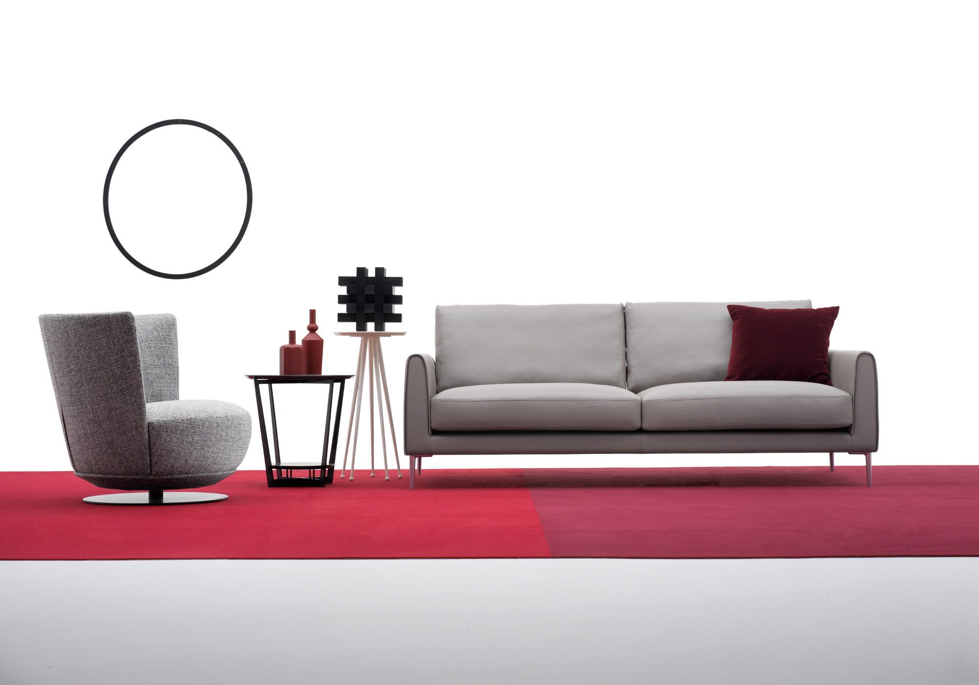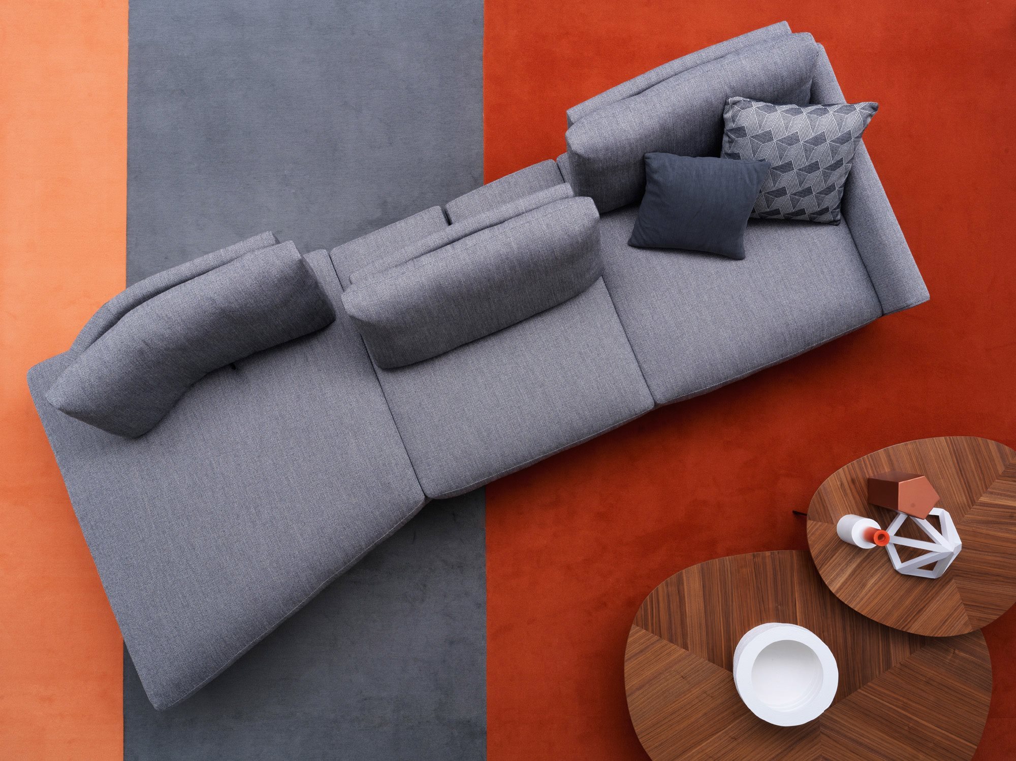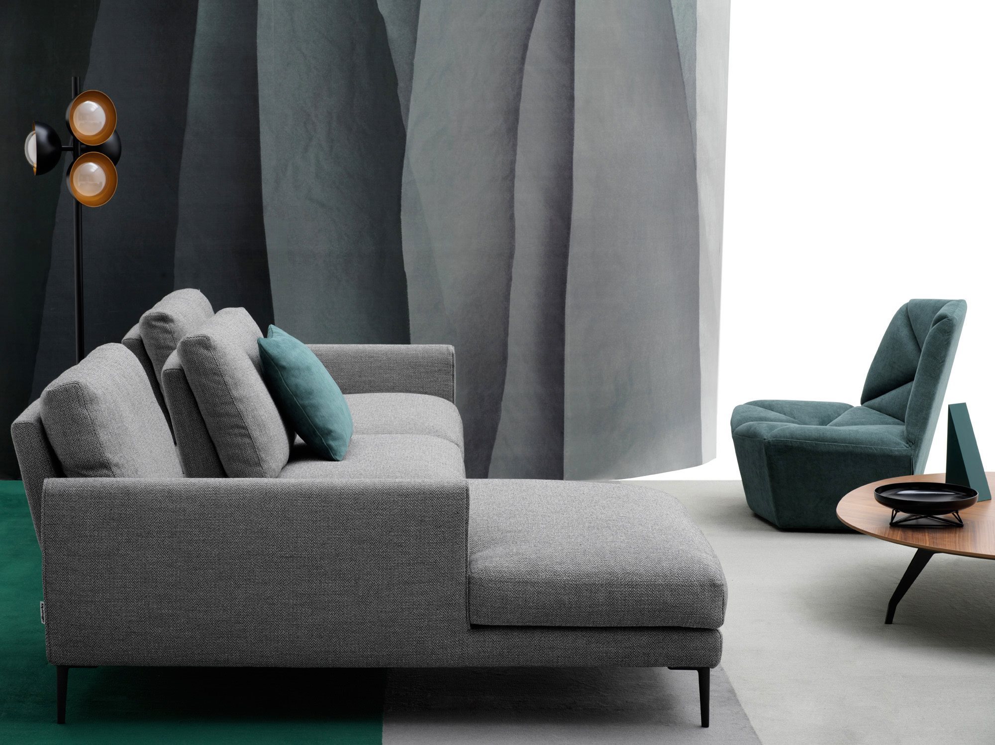One of Vega sofa’s distinctive features is the flexibility of use combined with a modern design and its simple and contemporary lines. The collection’s characteristic element is the sliding mechanism incorporated in the backrest that allows you to choose between two different depths; one that is suitable for sitting while the other is ideal for relaxation. At the same time, the slender design of the feet, available in chrome and gunmetal grey version, along with a small armrest give the sofa a fresh and modern look. Composite elements with an inclined cut and chaise longue complete the seating system, allowing to create unusual and customized compositions for multiple uses.