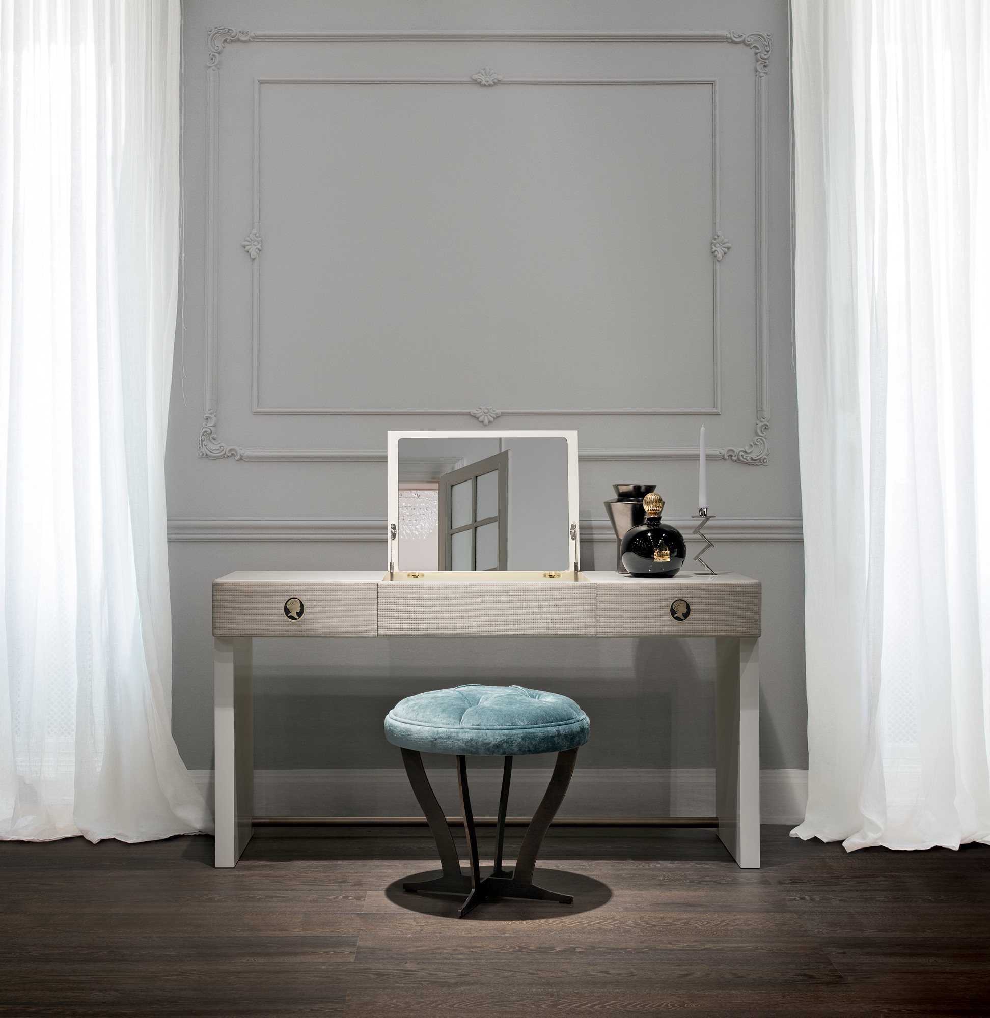 Jasmine is a family of refined storage units perfectly interpreting the new trends of contemporary living. The drawers are covered in printed leather with weave effect that lends the elegance and style typical of superior Italian leatherwear to the entire collection.