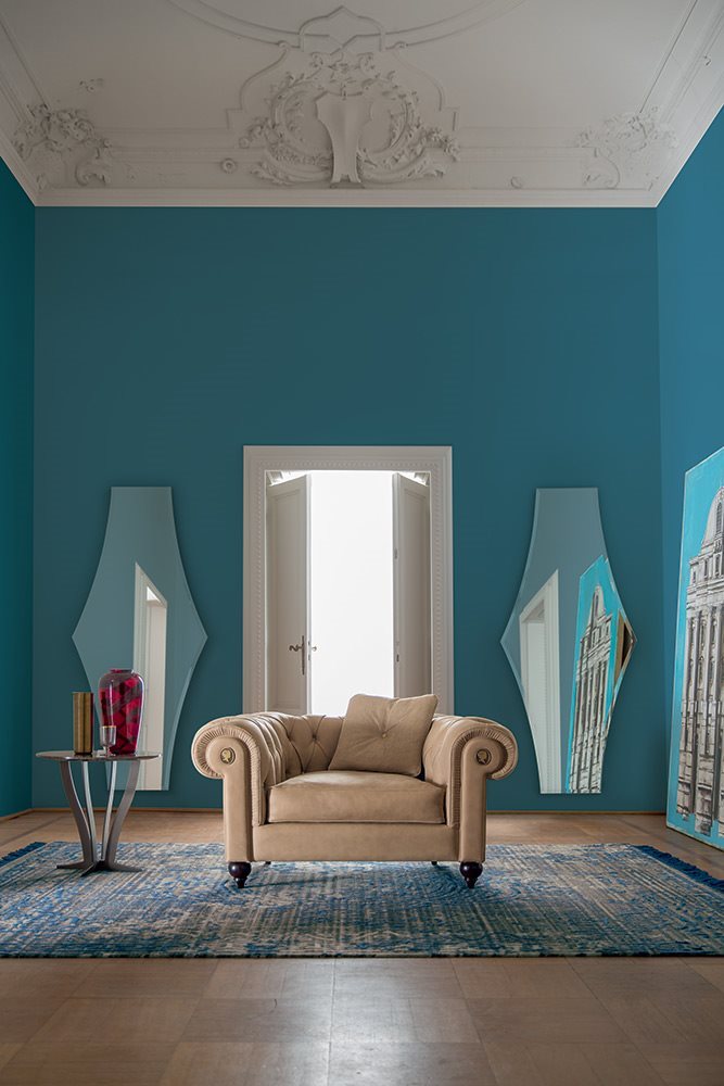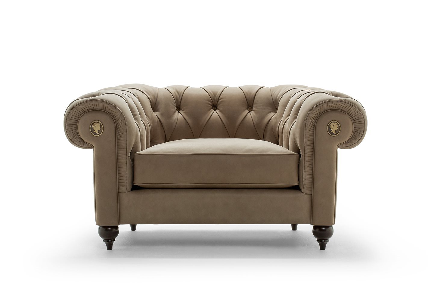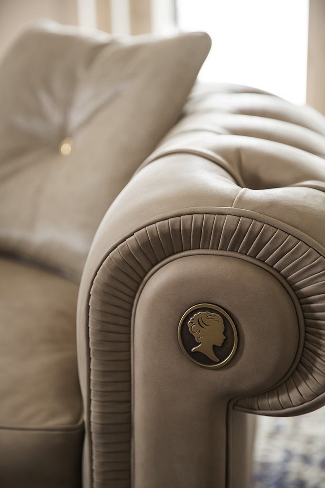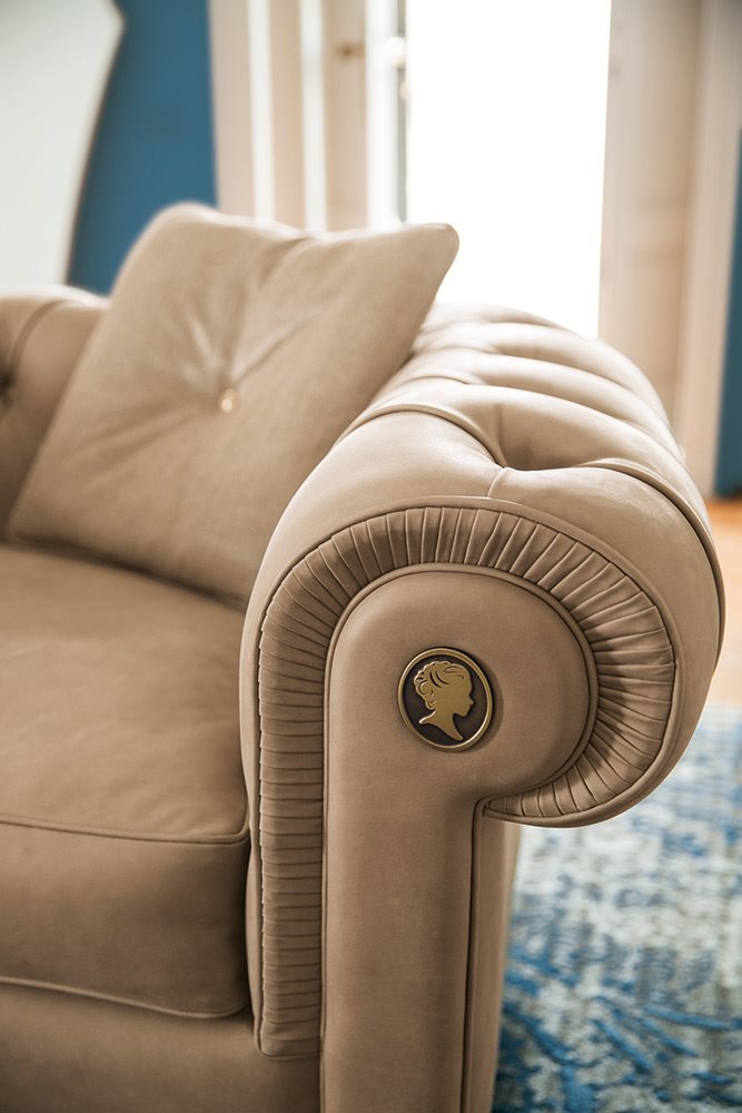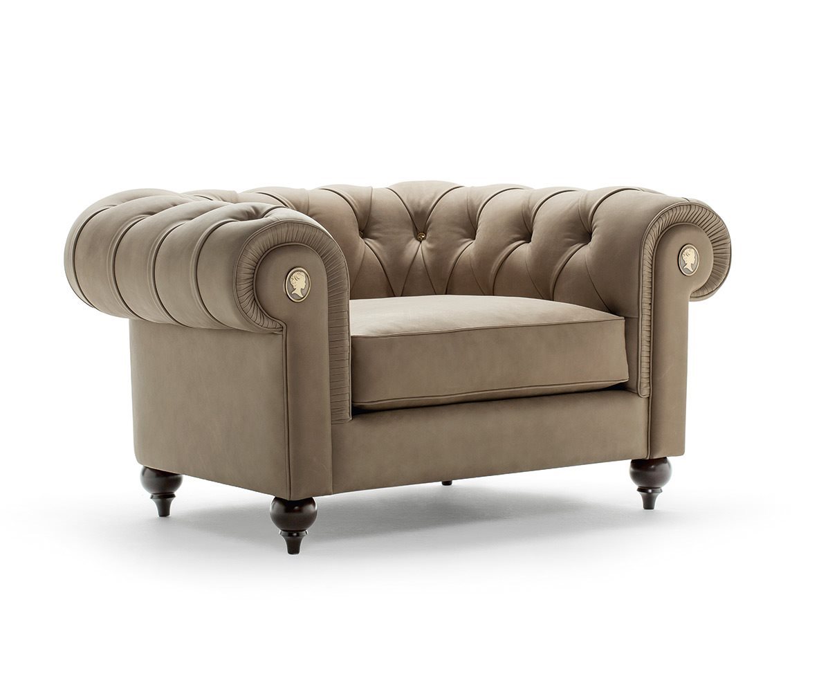 The Alfred armchair is inspired by the classic tradition of Chesterfield sofas while interpreted with a modern twist in terms of size and comfort. The metal buttons of the deep-buttoned upholstery are unique and elegant, giving further importance to the sofa that plays a leading role in your house. An example of the most refined Italian manufacture.