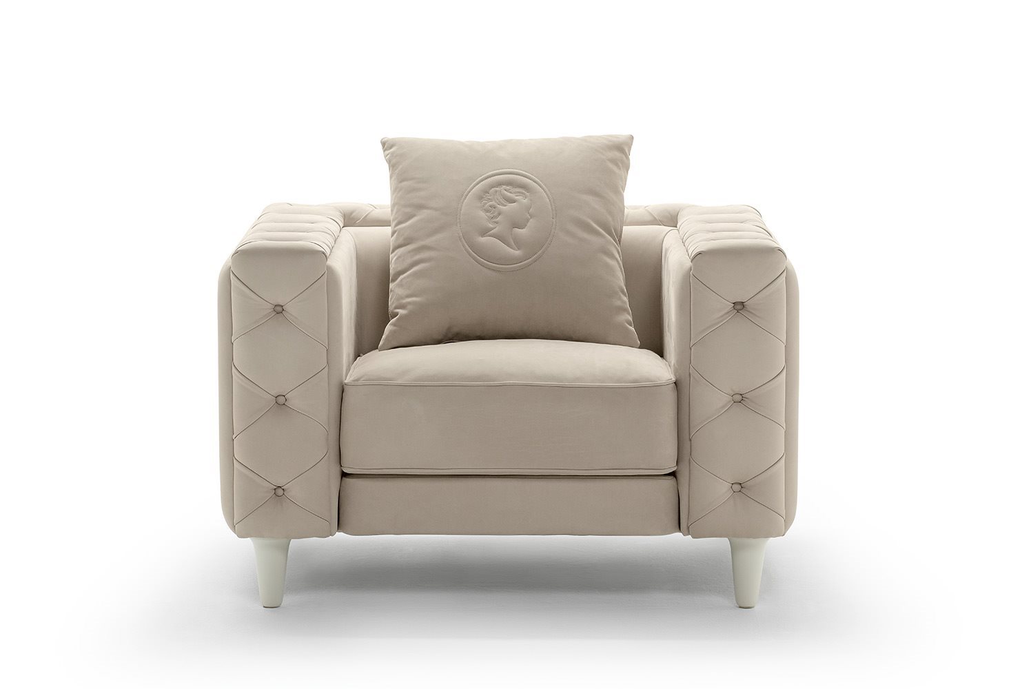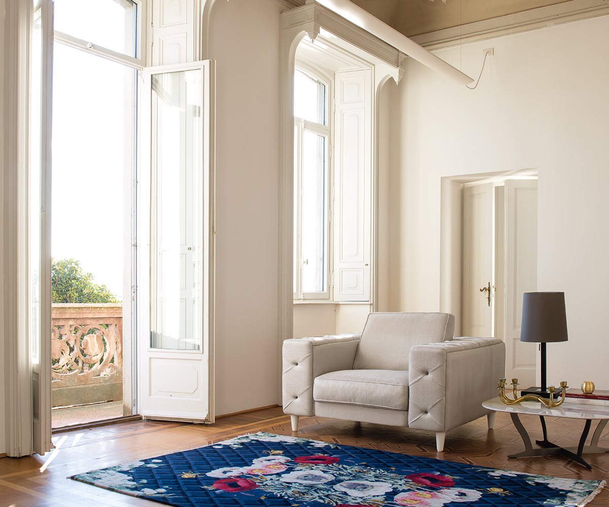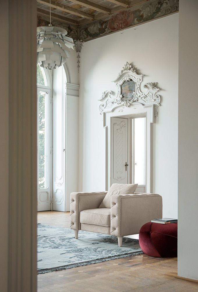 The Belmondo sofa is an example of unequalled luxury and charm. The precious appearance given by the crafted studded padding, and the modern lacquered feet create a highly impacting sofa, perfect for the more sophisticated interiors, either in the home or prestigious meeting rooms.