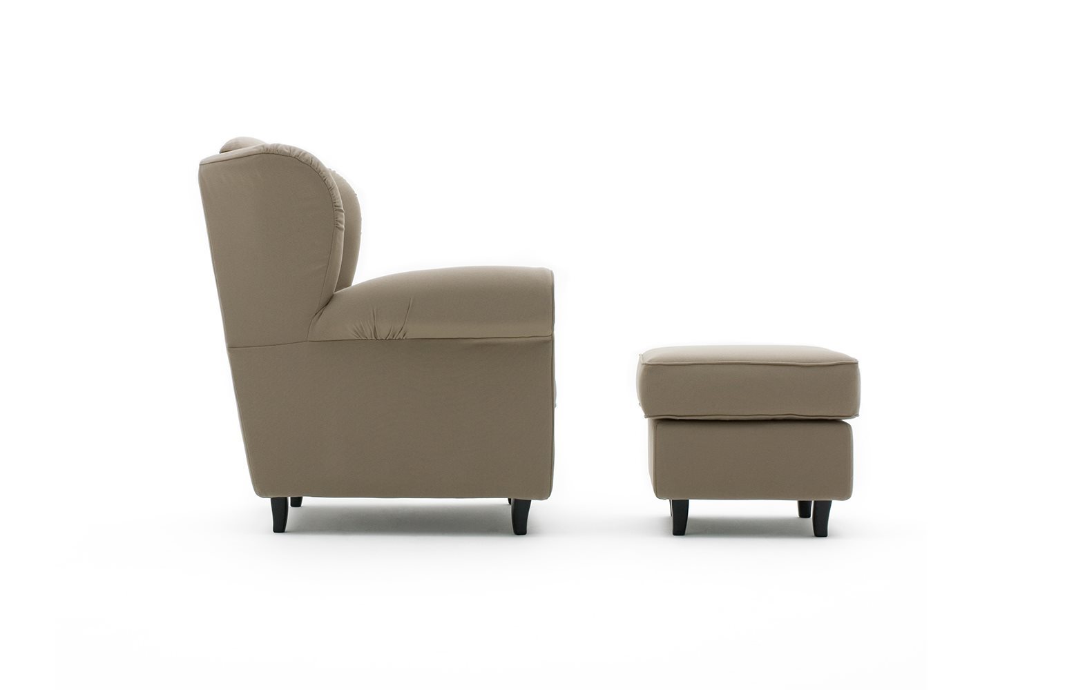 Poltrona e pouff. Piedini in legno finitura mogano, h. 12 cm.