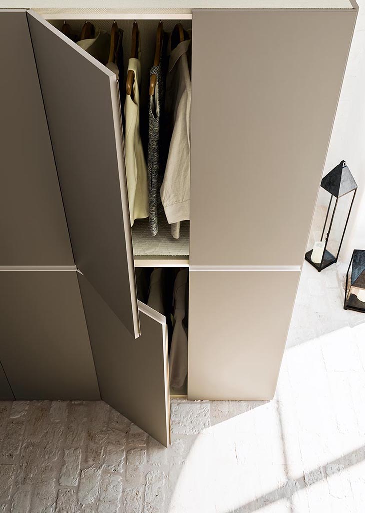 Orizon is a door designed for seasonal swinging wardrobes. This particular configuration features a horizontal handle profile that not only provides easy opening but also divides the door into two parts.