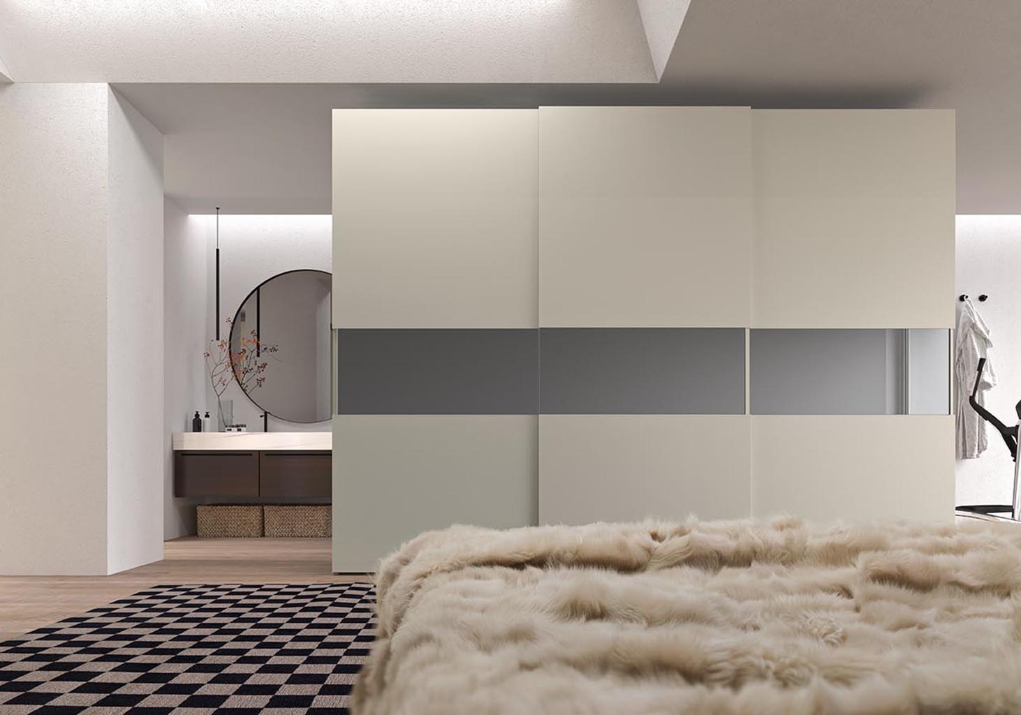 The door panel of the Clara wardrobe with sliding doors is divided into three parts. This feature allows you to play with numerous combinations of wood veneers, glass and lacquered finishes.