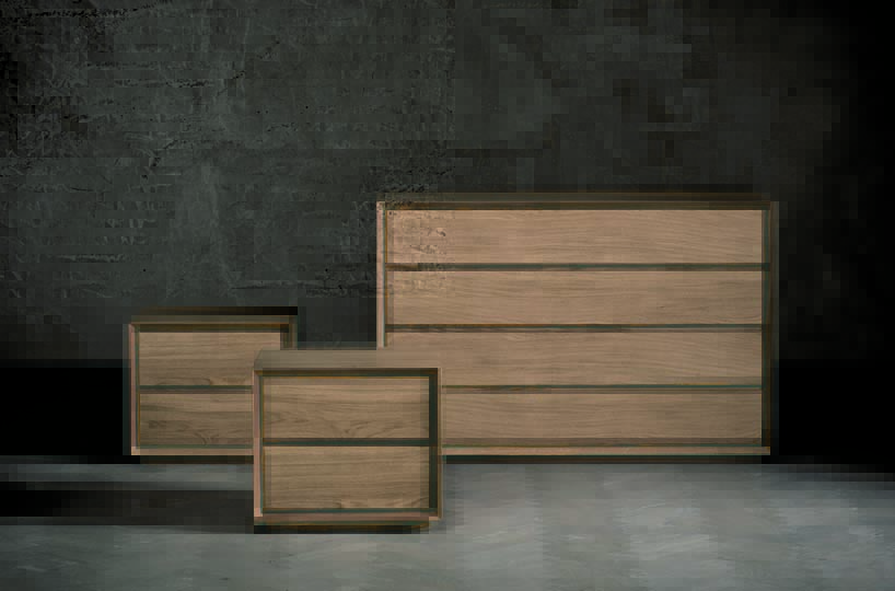 Nook bed group in solid blockboard oak. Composed of a four-drawer dresser, bedside table and weekly.