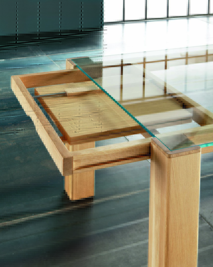 Sidney table with structure and legs in solid oak, multilayer extensions covered with 10/10 extra-thick oak veneer and extra-light tempered glass.top.