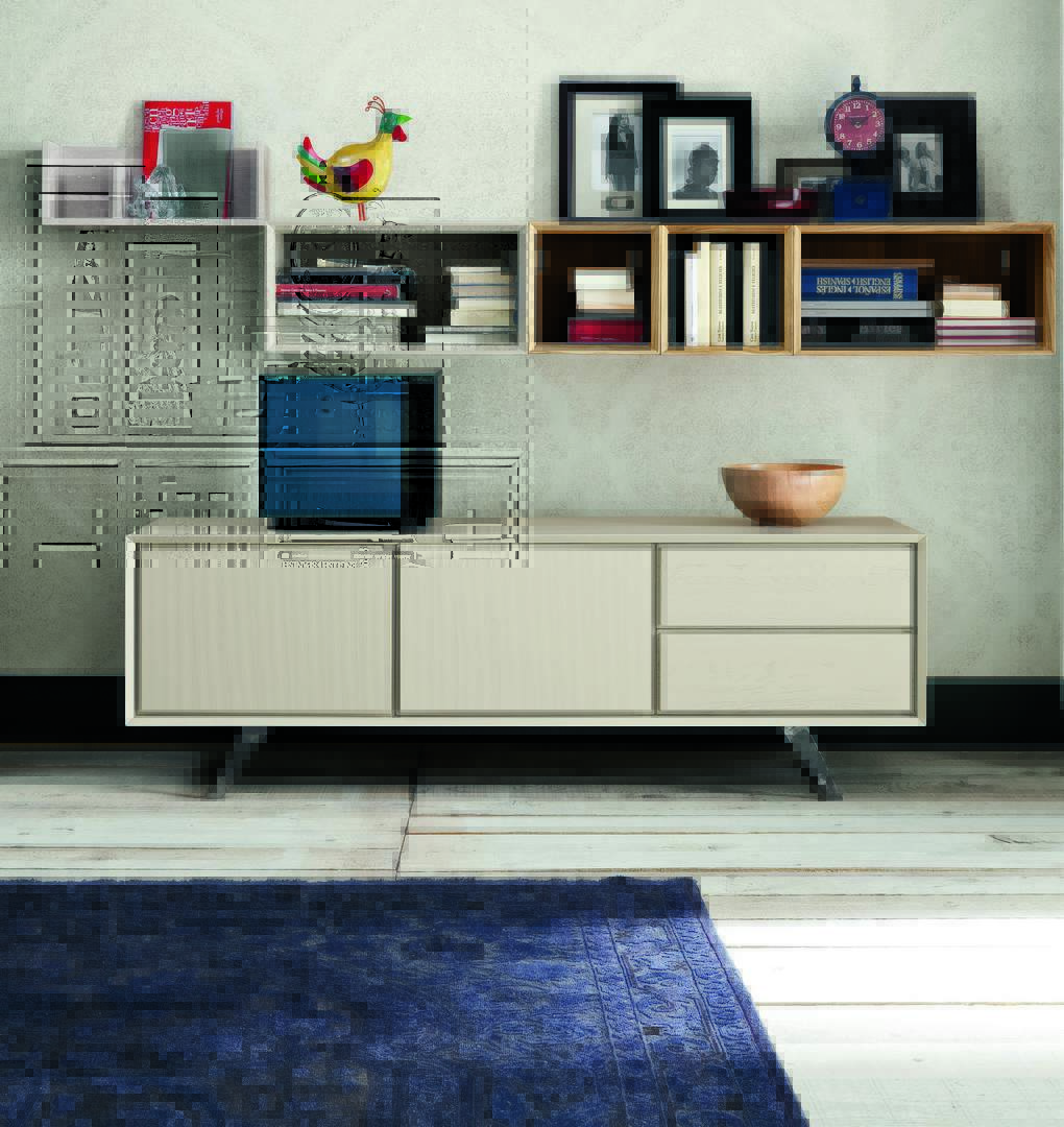 Nook TV cabinet with 2 hinged doors and 2 drawers, standing on brackets in Canapa sabbiato oak finish.