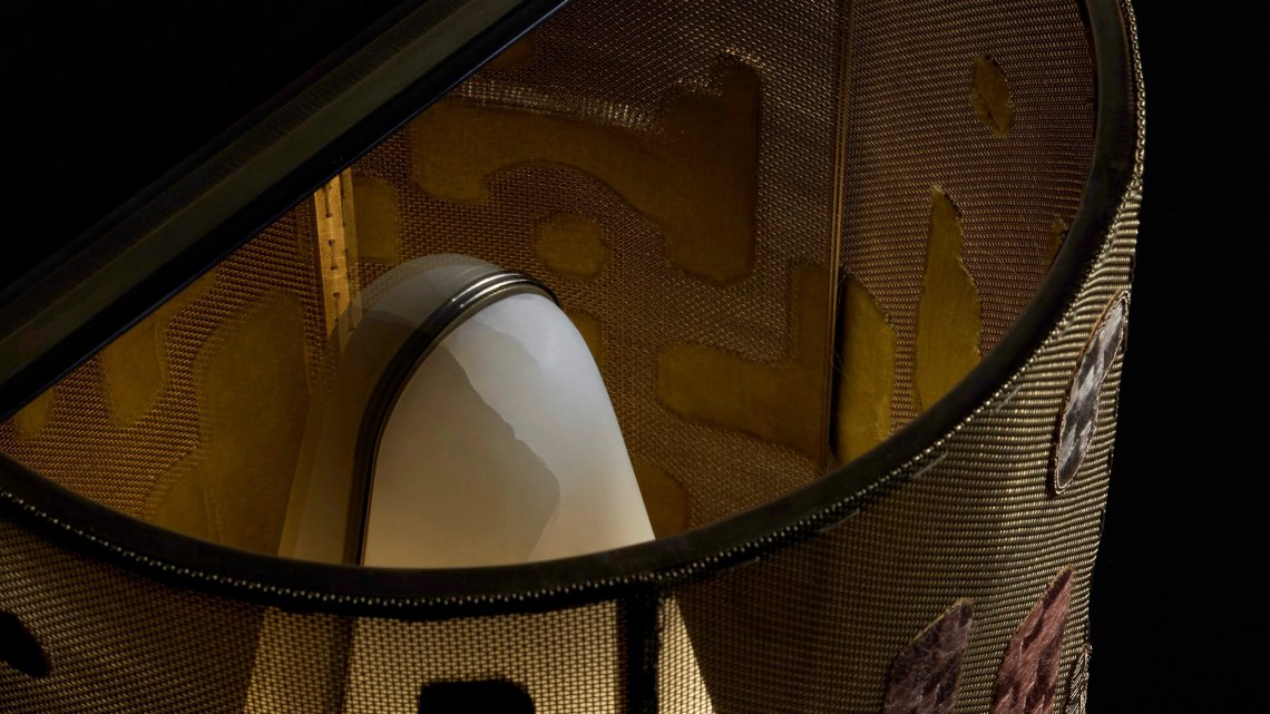 HAND-EMBROIDERED BRASS MESH CREATES A DELICATE CAGE SUSPENDED AROUND AN ILLUMINATED ALABASTER CORE. THE DIMENSIONAL BEADING AND THREADWORK EVOKE SYNESTHETIC INTERPRETATIONS OF A MUSICAL SCORE, ORGANIC FORMS RECORDED ON A STRICT GRID. THE ROUNDED SILHOUETTE OF THE MESH CAGE FORMS A VEIL OVER THE GLOWING STONE, AN AIRY METALLIC CONTRAST TO THE WARMLY GROUNDED MATERIAL.