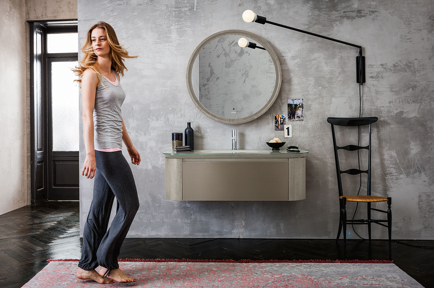 Portalavabo con struttura in nobilitato melaminico idro RAL7010 rivestita in FRASSINO laccato finitura Cotone, Canapa, China o NOCE CANALETTO NATURALE. Frontali cassetto/cestone in cristallo smaltato o decorato (Bianco assoluto 30/ specchio). Apertura/ chiusura manuale.