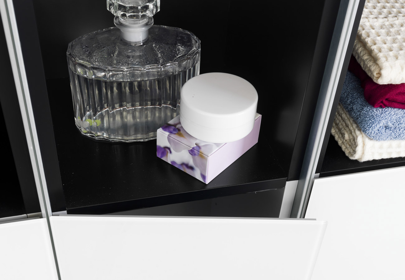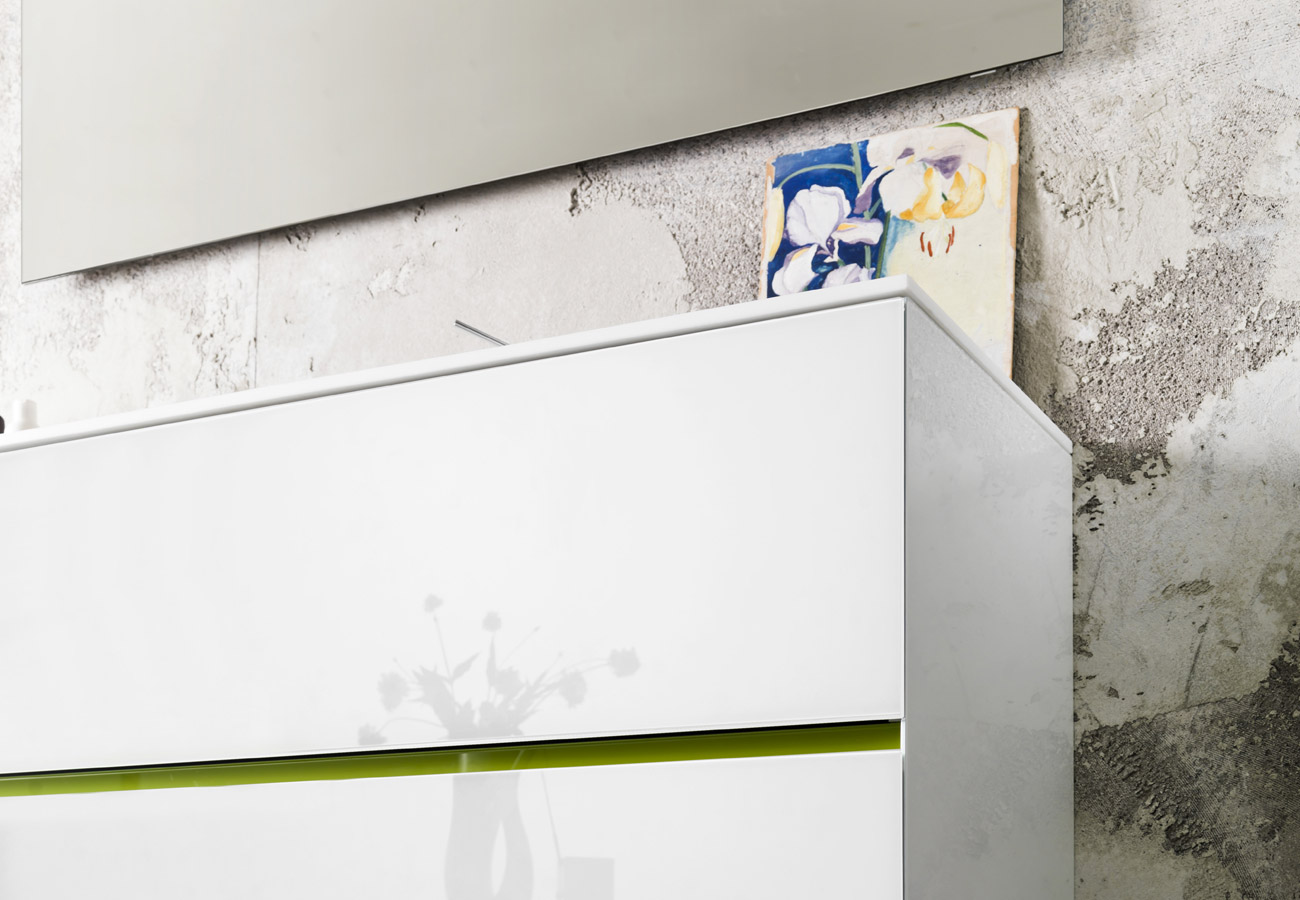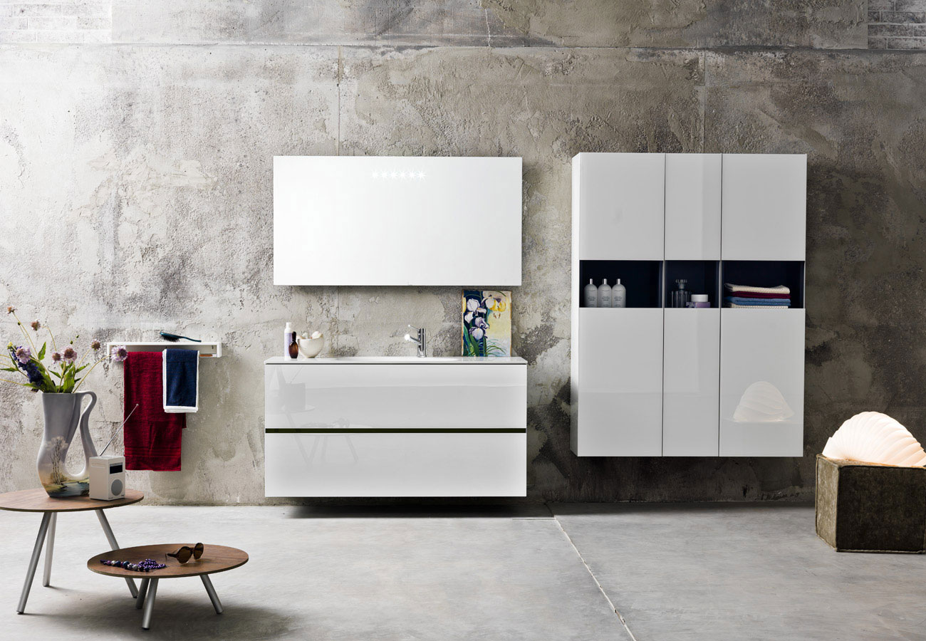 Per questa collezione è stato pensato un lavabo integrato dalla fusione particolare che permette di sfruttare al meglio tutta la profondità del mobile e di poter usufruire di miscelatori sia da appoggio che a muro.