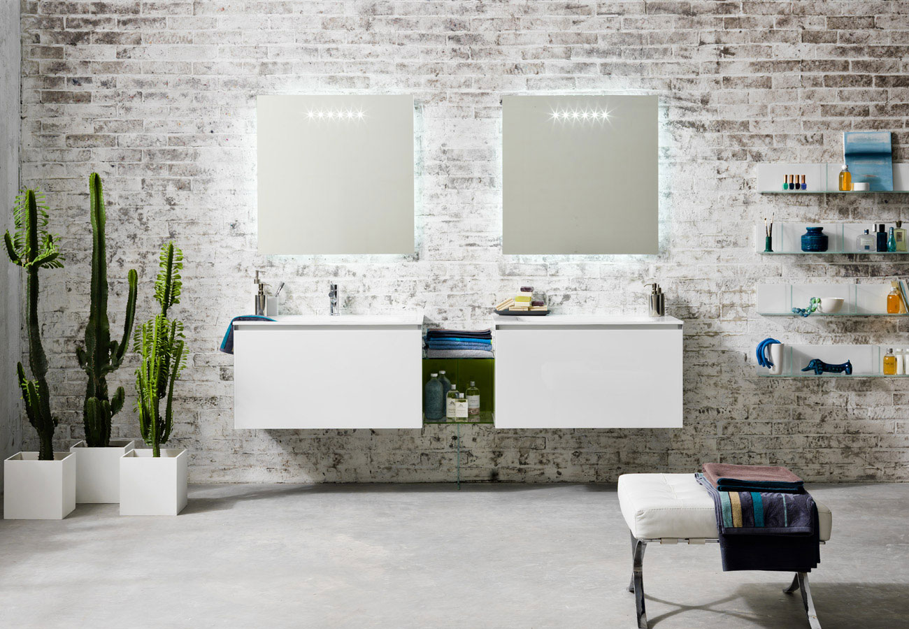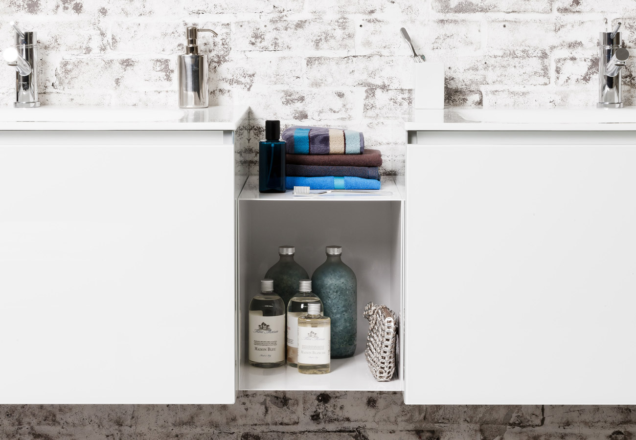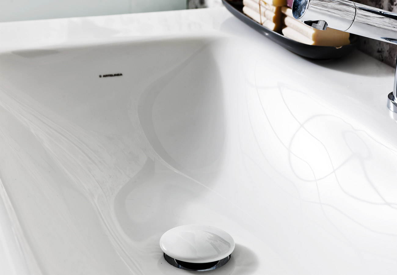 Per questa collezione è stato pensato un lavabo integrato dalla fusione particolare che permette di sfruttare al meglio tutta la profondità del mobile e di poter usufruire di miscelatori sia da appoggio che a muro.