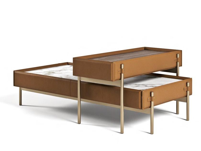 Coffee table low, cm 124,5x60x28h Top in E ramosa marble cross cut, frame in Cuoio col. Dark Mocha, flaps in Cuoio col. Dark Mocha, metal structure in light gold
