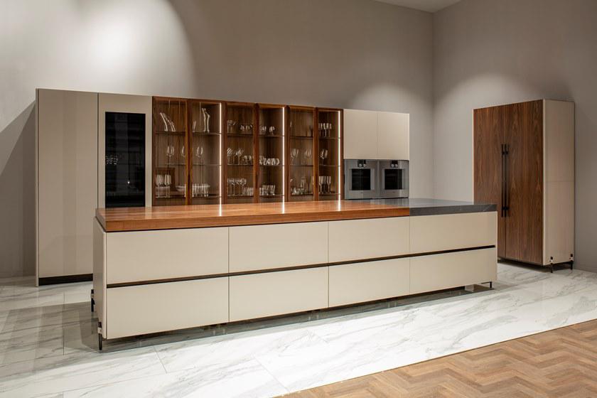 V888 Kitchen Island cm 390x120x94h Materials: Cuoio leather on the sides, canaletto walnut veneer and Grey Pulpis marble for the top. Lacquered drawers with cuoio leather details on tone. Metal legs in titanium color finish but also available in any RAL color. Back cabinet cm 520x65x220h Materials: Cuoio leather, blockboard wood, canaletto walnut veneer, blum mechanisms, Salice hinges, brushed glossy paint, lacquered wood in any RAL color and also matching with cuoio leather tones. Metal fittings Titanium color finish but also available in any RAL color. V242/S Bar stool cm 43x65x89h or 104h Materials: Cuoio leather, fabric art spiga, metal frame Titanium color finish but also available in any colori