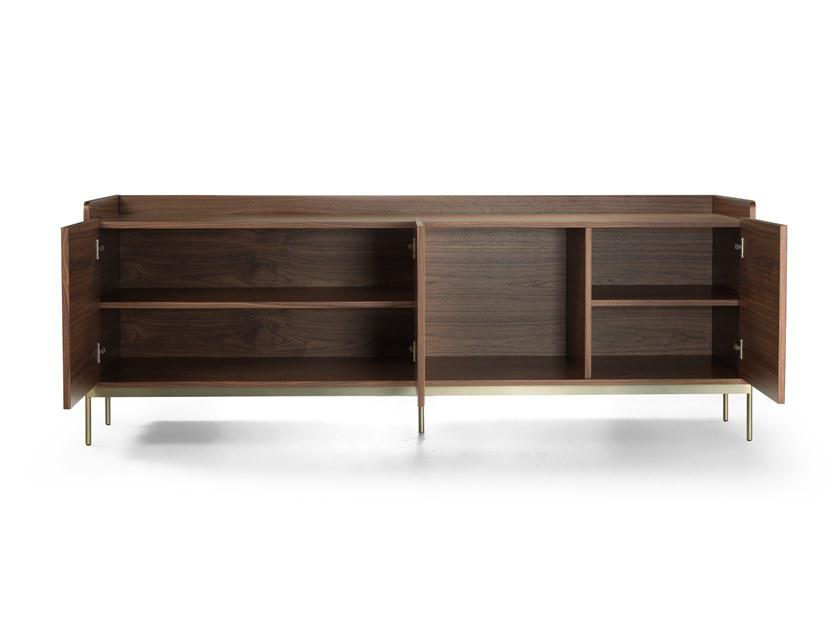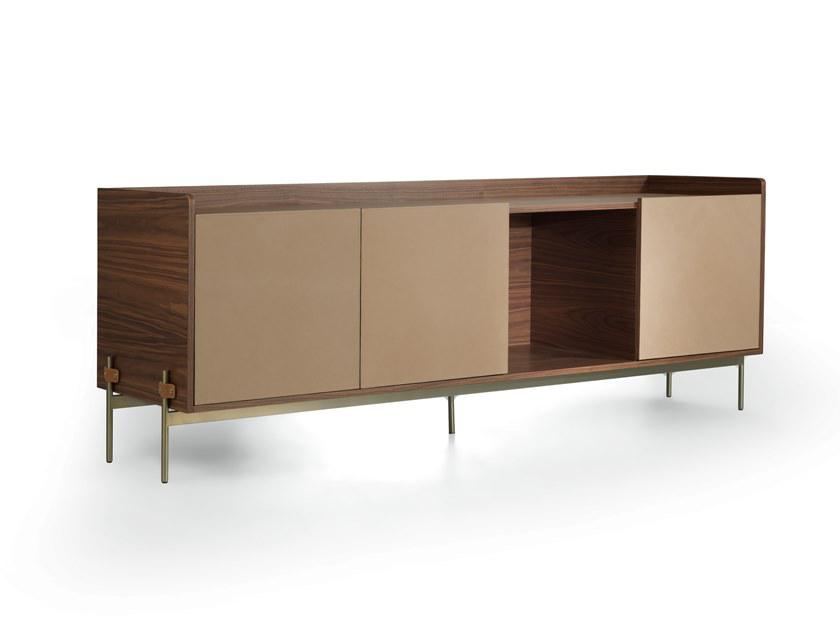 Sideboard, cm 230x60x83h Structure and top in Canaletto Walnut veneer open pore finish, doors in leather Skin Plaster, metal feet col. light gold finish with cuoio details.