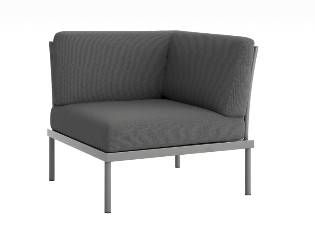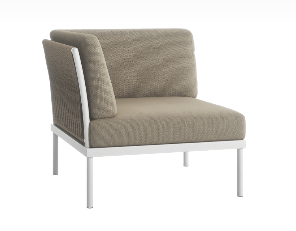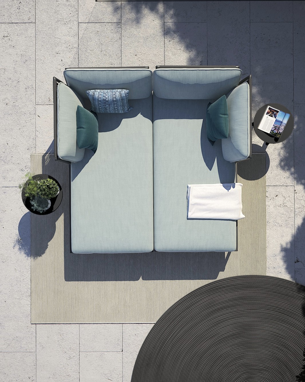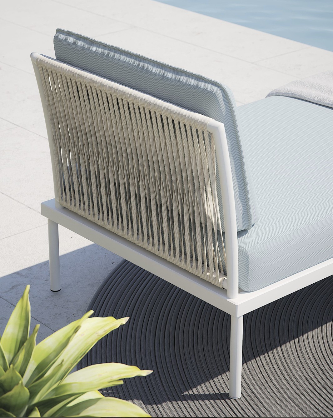 Struttura in alluminio verniciato epossidico per esterni, intrecciato a mano in fibra termoplastica acrilica Teflon, idrorepellente e di facile pulizia.