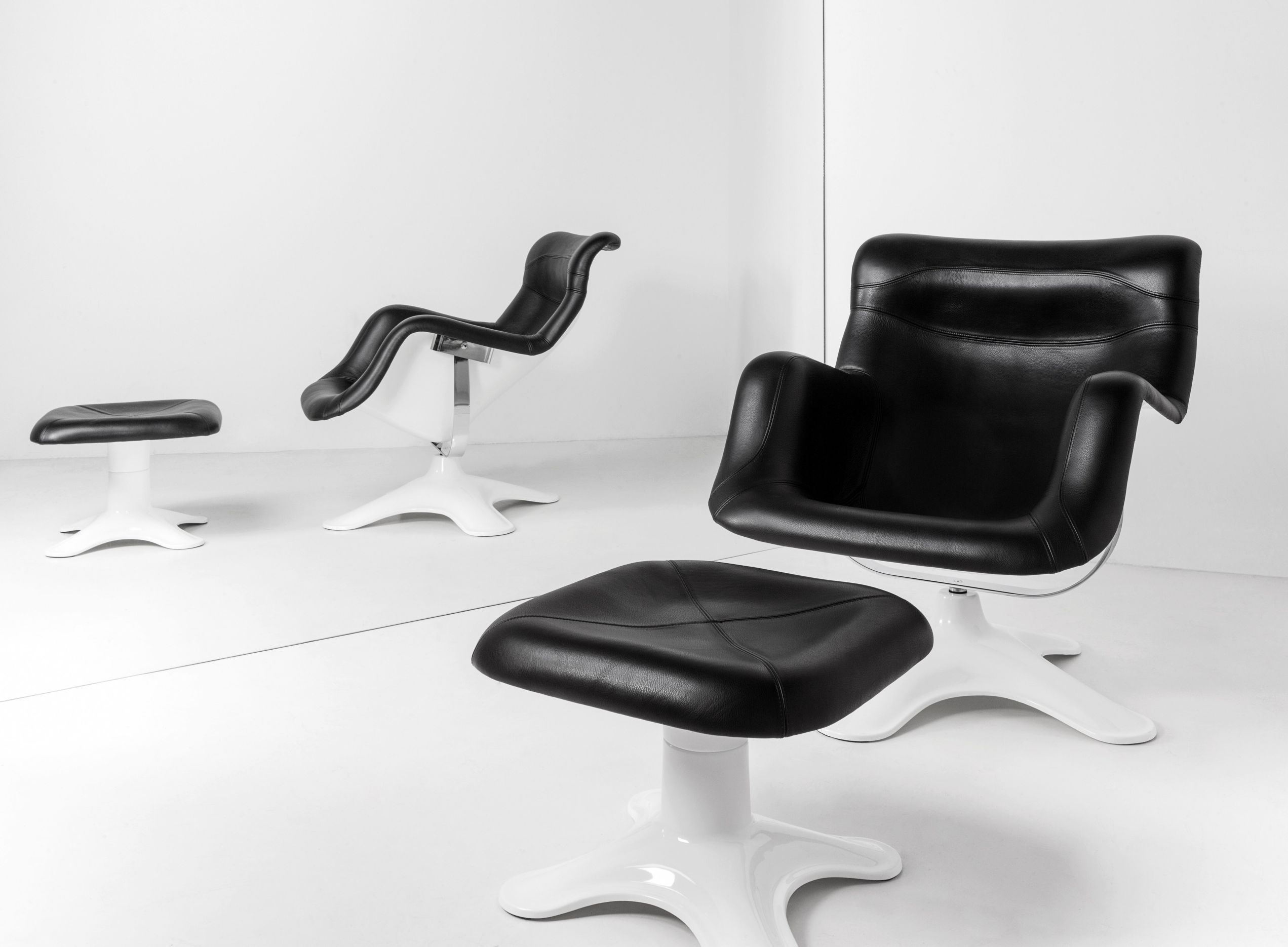 Karuselli Ottoman是Karuselli休閑椅的陪伴者,也是設計師Yrj?Kukkapuro對功能,人體工程學和有機形式的完美結合帶來終極舒適感的延續。 矮凳由位于白色玻璃纖維底座上的軟墊皮革上衣組成。