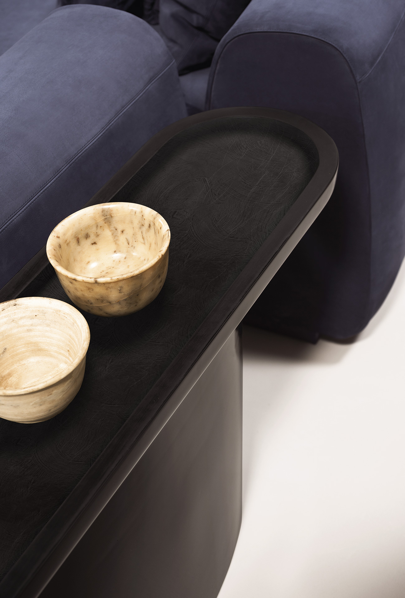Frame in solid lime wood. Glossy black shellac finish and matte scratched shelf.