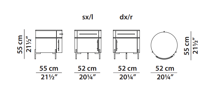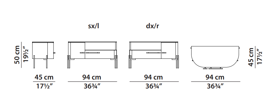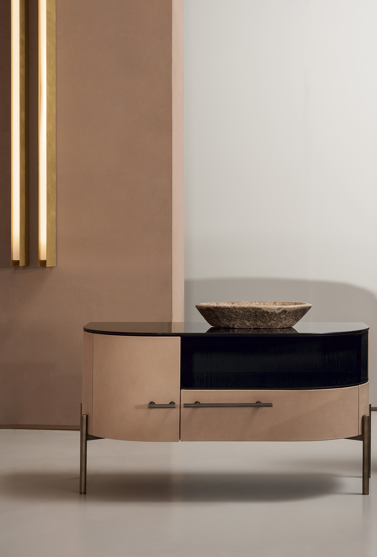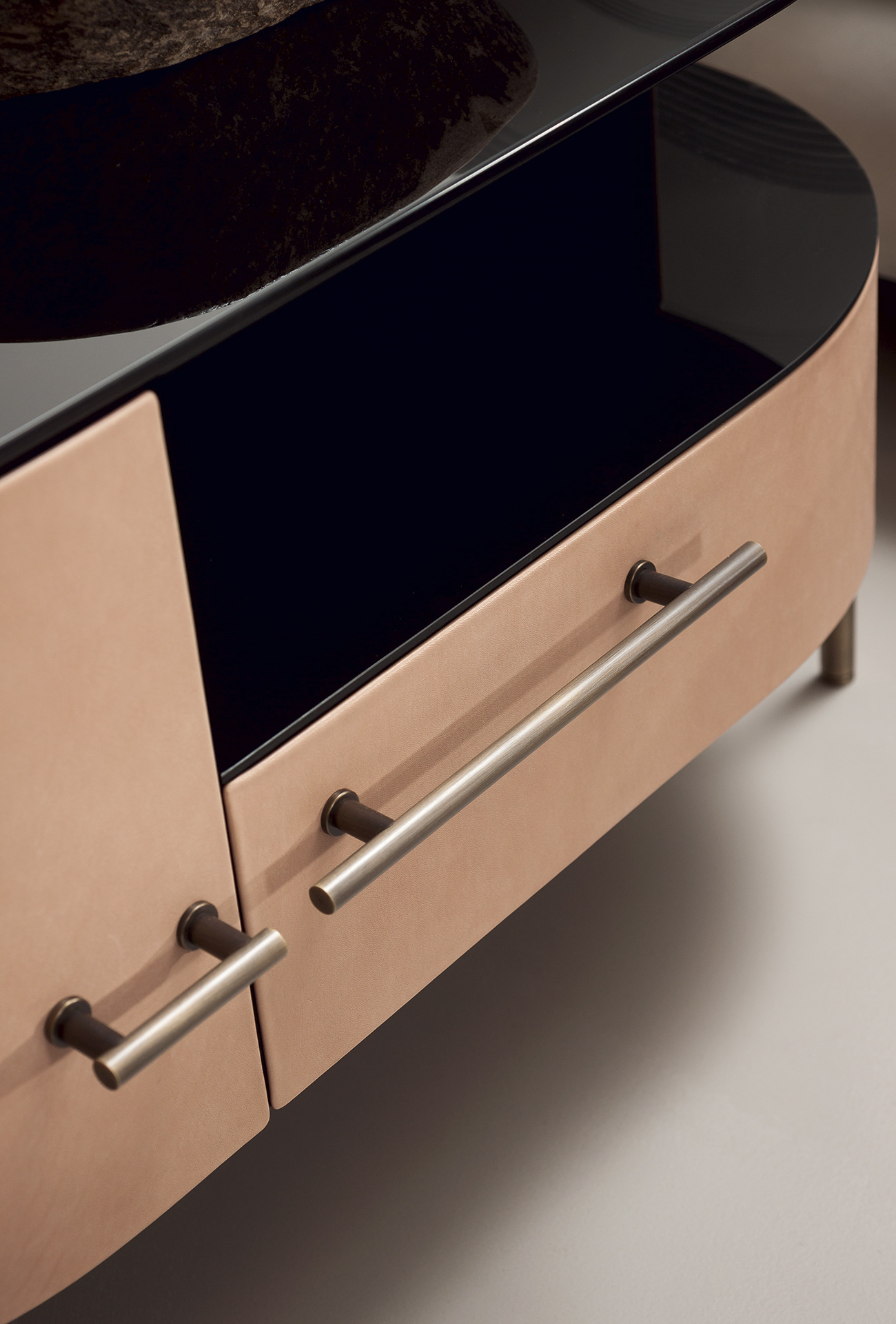 Structure in curved plywood and MDF, matte black-stained oak veneered. Leather-covered shutter and front drawer. Base, handle and details in hand-finished burnished metal with matte varnish. Top in black rear lacquered glass and inner shelf in smoked extra-light colour 8 mm thick glass.