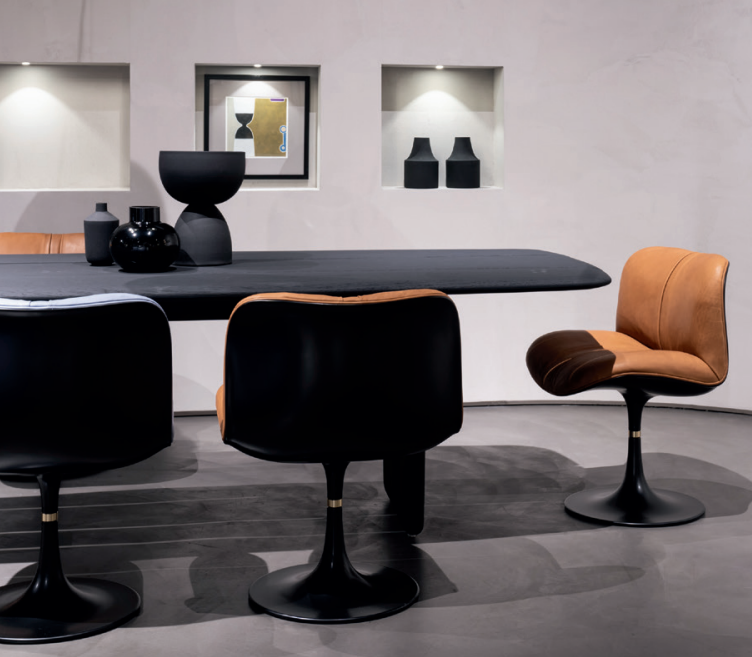 Crossing the threshold into the dining or study area, however, those same characteristics interpreted in the version featuring sandblasted solid ash that has been stained black take on a more solid personality. It is the versatility with which Nairobi succeeds in giving substance to the idea of the world we have built up through travelling and living, the synthesis of the freest experiences and those regulated by the rules of coexistence; it indicates a more relaxed way of welcoming, a conversation without labels.