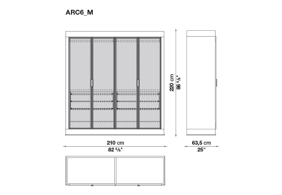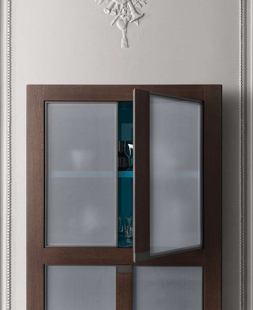 The Eracle series extends from the living room to the bedroom with an unusual storage unit of strictly calibrated proportions, very easy to use. The new volume, also in double-sided version, has the same characteristics defining the storage units for the living room: volumes, doors and back panels with coupled transparent glass (with high-tech internal fabric) and bronzed nickel edges. The fine materials guarantee a minimal and sophisticated look also to the new element: the frame is made of brushed light oak, grey oak, brushed black oak, smoked oak and natural wenge; the inside is covered with coloniale leather melamine faced and equipped with a bronzed nickel painted chest of drawers. Trays and clothes rails covered in coloniale leather and a full range of accessories offer a wide range of personalization solutions. The light placed inside the unit is a refined vintage detail recalling the display furniture of the 1950’s.
