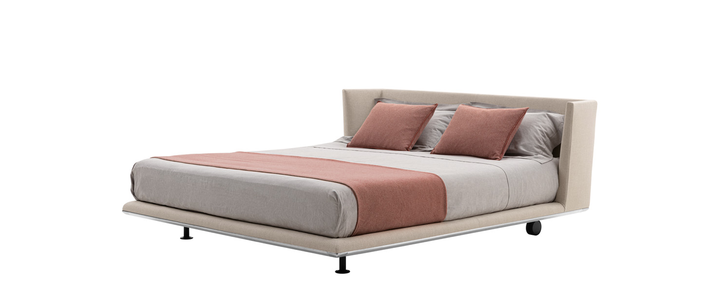 A brand new element in the Noonu archipelago is the bed. Its lines echo the design of the sofa, in particular the headboard, an element that instantly stands out for its understated grandeur, attracting the eye and enveloping the body. In pure Noonu style, the underlying frame is slightly suspended off the ground as if floating on the floor. At the base of the bed we find the usual metal profile in curved aluminium, available in bright brushed, black chromed and pewter grey versions. As with the whole Noonu range, the bed can be covered in leather or fabric. For ease of movement, the bed can rest on four fixed feet or on two fixed feet and two wheels, positioned inside the frame to remove them from view.
