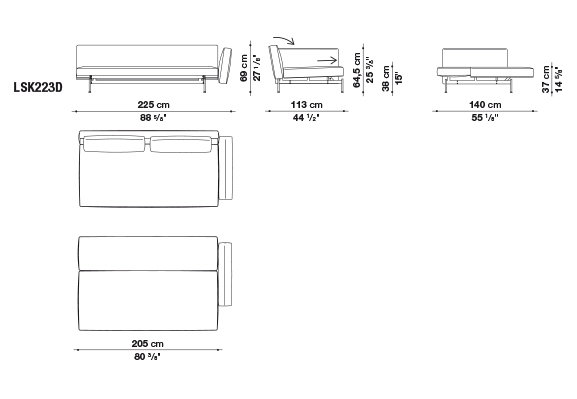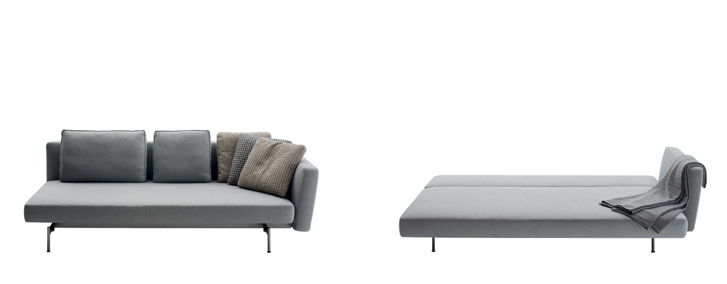 SAKé signals the beginning of Piero Lissoni’s collaboration with B&B Italia. The design begins from a strongly contemporary seating system distinguished by a careful search for formal balance. Seats in three sizes (cm 175, 210 and 270), with embracing or linear backs and arms of various dimensions added harmoniously to create a sofa adapted to the customer’s space and personal taste. The system is enhanced with a chaise longue element (cm 105 x 135) that lends itself to various interpretations: as the terminal element in a linear composition, with a more enveloping back and with the addition of armrests, it can stand on its own or, alongside another chaise lounge, it can create a sofa with deep seating. The details of the cushions and support base contribute to the design lightness. The seat cushion has refined modular stitching, ranging from cm 35 or cm 45; the back cushions, available in two sizes, are outlined by profiled bands. The seating system support base is made of crosspiece with rounded steel feet connected to each other by a bar.