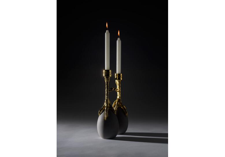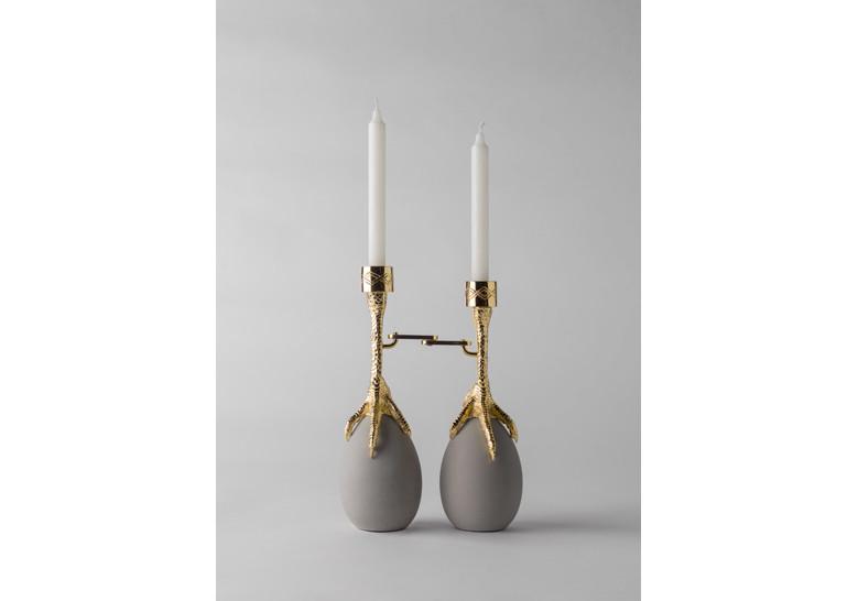 Garras de fundición de latón y bisagra de acero, ambas con ba?o de oro de 24 kilates. Huevos de cemento.