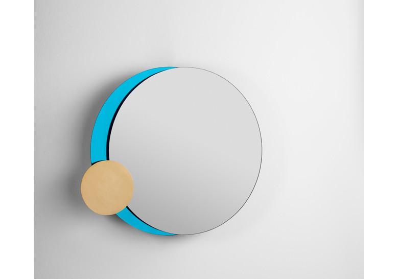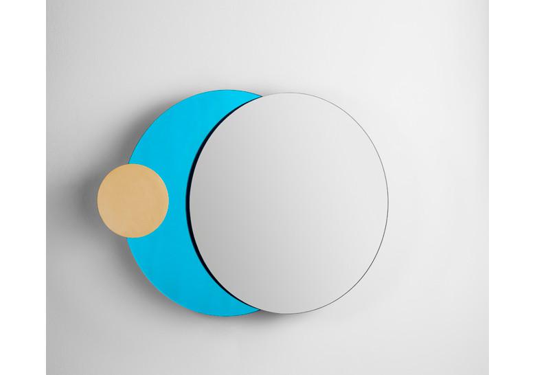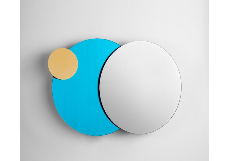 Espejos de color azul y gris. Disco de aluminio ba?ado en oro. Caja de MDF lacada en negro. Sistema de