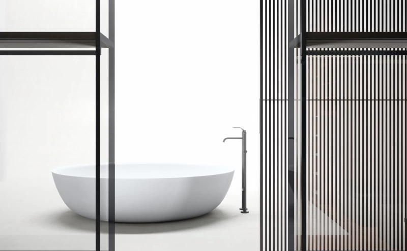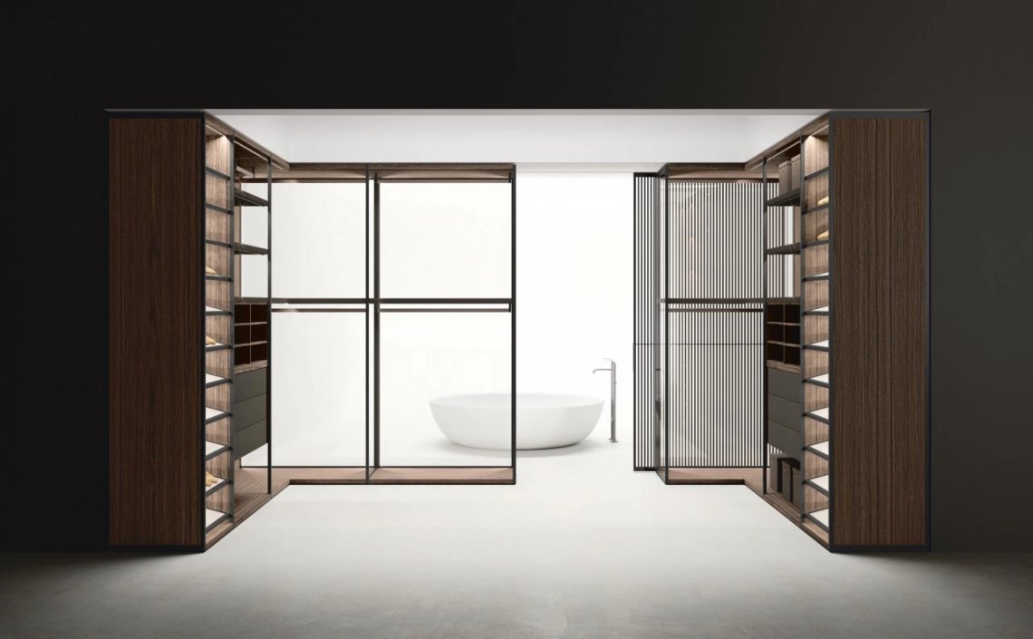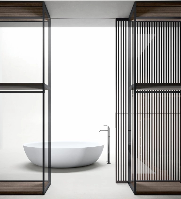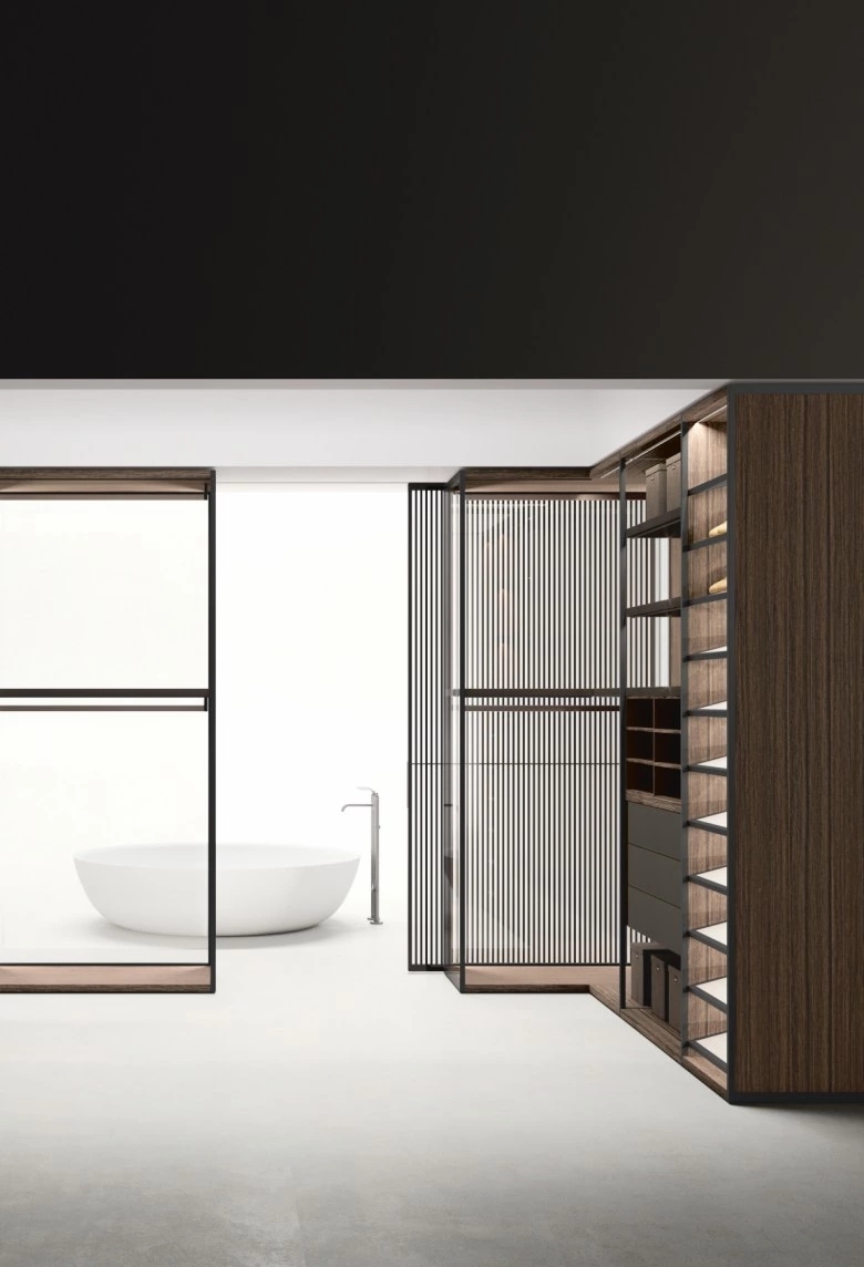 Modular floor-to-ceiling door system with sliding or pivot opening. The self-bearing doors have anodised aluminium frames with a matt black finish and tempered glass surfaces (6 mm thick) in 4 variants: transparent (float), Extralight frosted, transparent smoky grey, Extralight frosted painted white. The Greene model has an aluminium profile frame, while the Shades model has frame and internal profiles in anodised aluminium profiles (the internal profiles are vertically inserted on the frame, over the entire surface of the panel). The doors can be fitted in single or multiple versions, thus creating light and functional divisions between the working areas of the house, for example between dining or living room and kitchen, between living room and study or again between bedroom and walk-in wardrobe. Design Piero Lissoni.