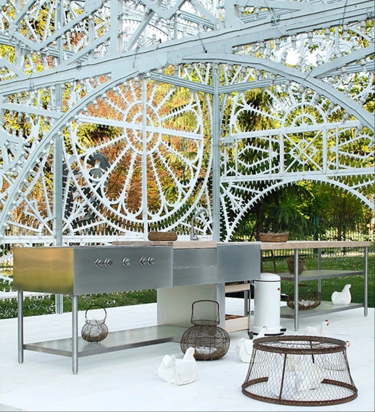 It is a minimalist kitchen consisting in an open-faced structure, specifically engineered for external use. The designer Piero Lissoni declared “Open is not a kitchen, it's much more. It's a machine, for preparing dinner, having a drink, listening to music, chatting with friends, cooking a meal or enjoying a good dish. The bodywork of this machine is in brushed stainless steel, natural woods and industrial-grade glass.” The core of Open is the AISI 316 stainless steel monobloc for cooking and washing. In the centre of the composition there is a removable chopping board in solid Iroko wood and below are housed two drawers. The block is supported by tubular steel frame with a shelf in transparent wired glass. The set is completed with a trolley on wheels to be placed under the sink, with a matt satin stainless steel structure, composed by 3 upper and 7 lower compartments in solid Iroko wood. The cooking and washing block can be combined with a large snack counter in solid Iroko, supported by a tubular steel structure equipped with two lower shelves in wired glass.