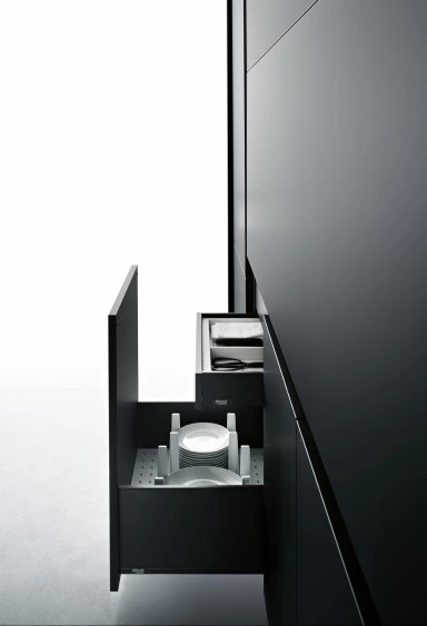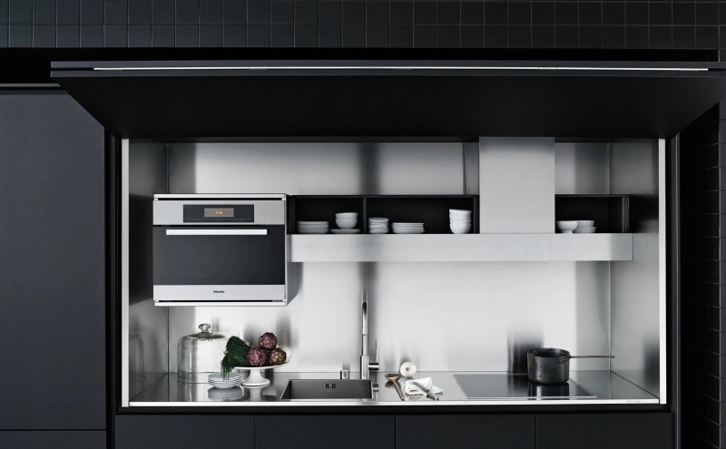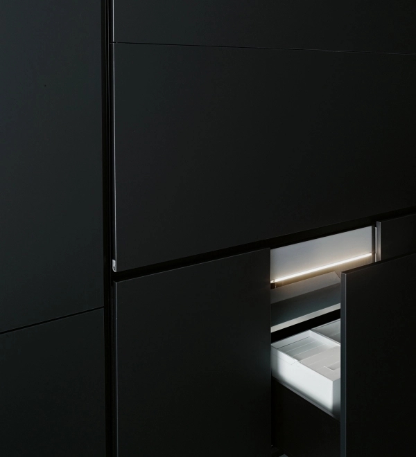 The ON-OFF ST modular kitchen is characterised by a self-standing structure equipped with folding door, which opens upwards electronically, revealing the worktop area inside. Once closed, it completely conceals the working area, transforming the kitchen into a monolithic furniture piece. The base units are available with or without handles and a tall unit with side-recessing door can be positioned next to them. The working area can be fitted with back panel, shelves, open-faced units, hood and a suspended compartment for oven. The oven can also be installed in tall unit.