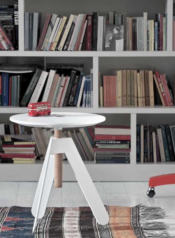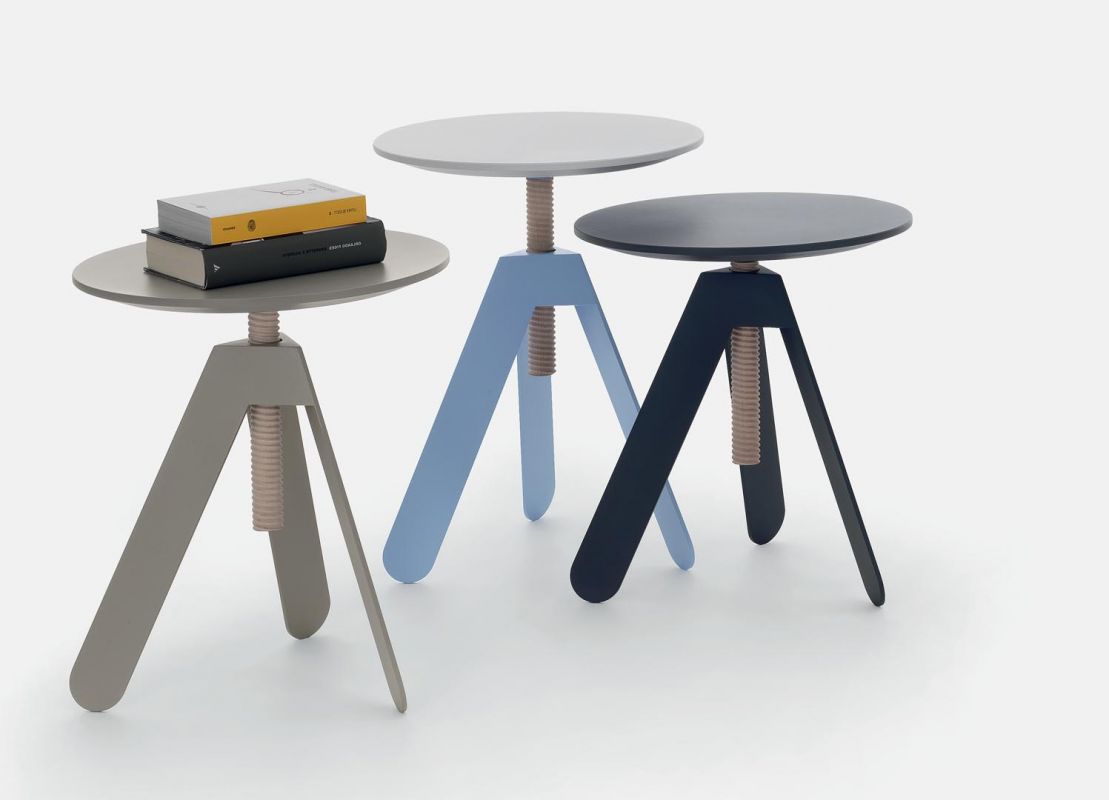 Coffee table with adjustable height. Screw in solid Wood ash. Metal lacquered frame. Top in veneer or lacquered Wood.
