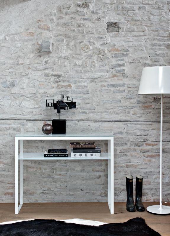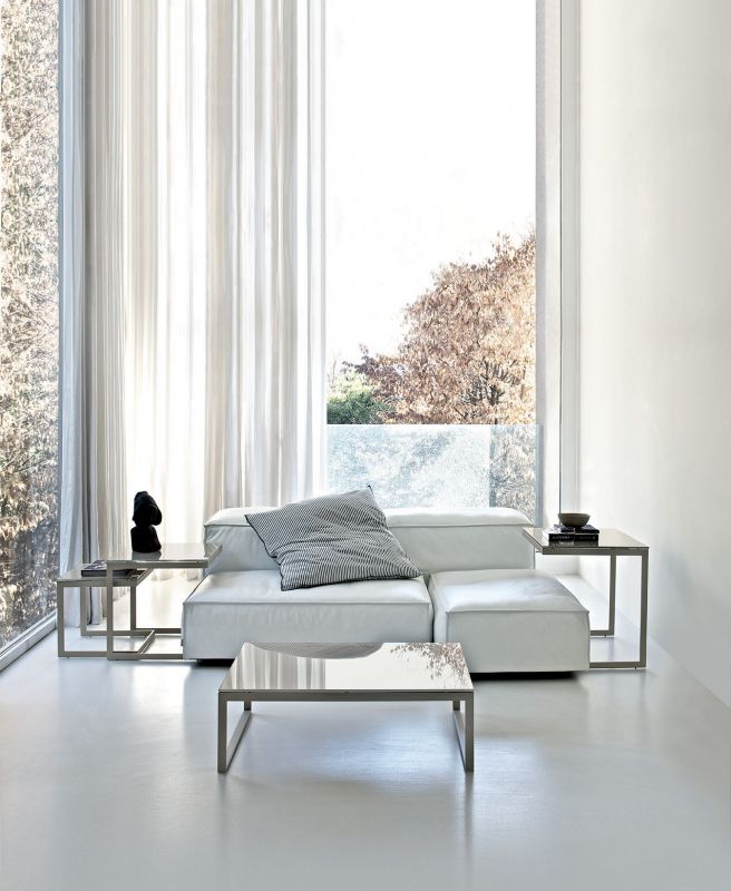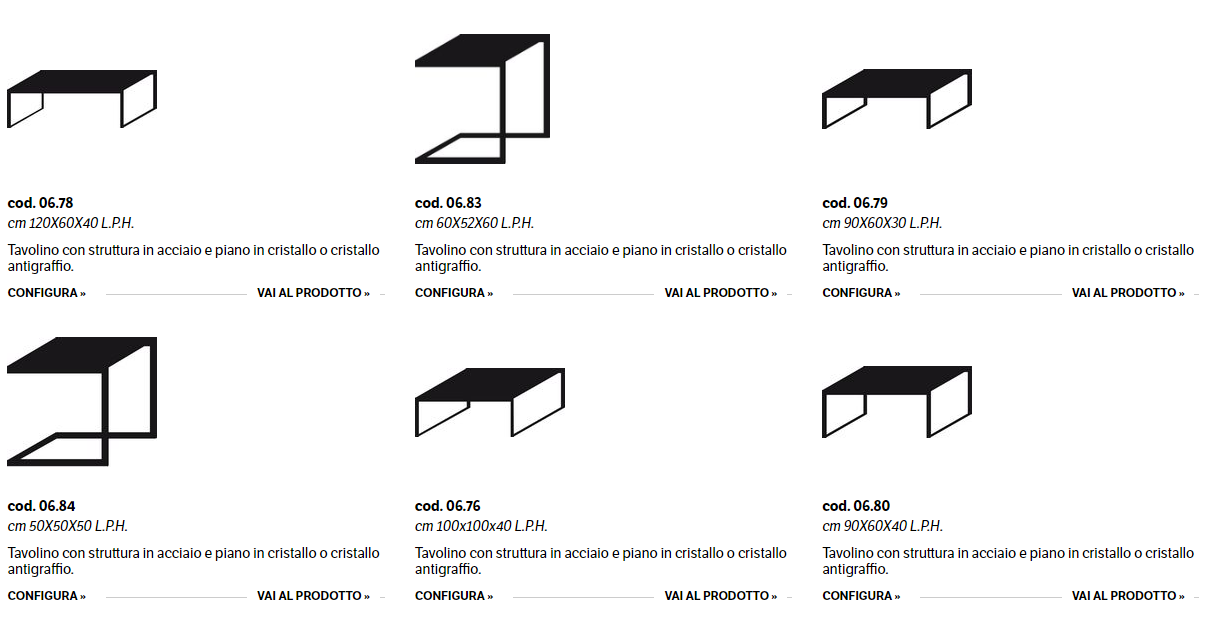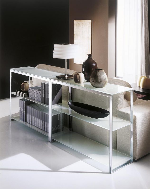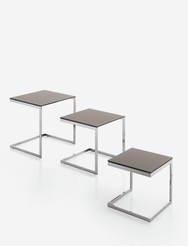 Tavolino con struttura in acciaio e piano in cristallo o cristallo antigraffio.