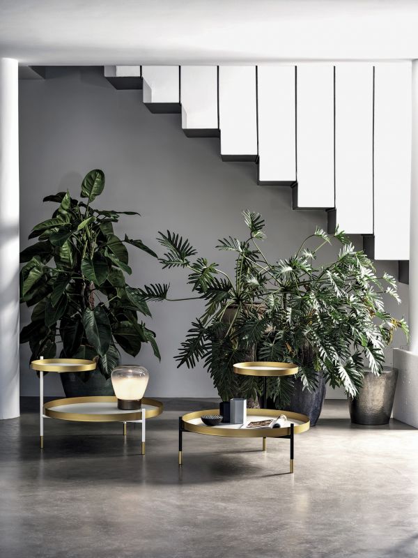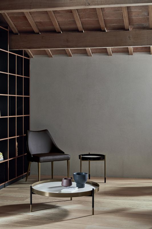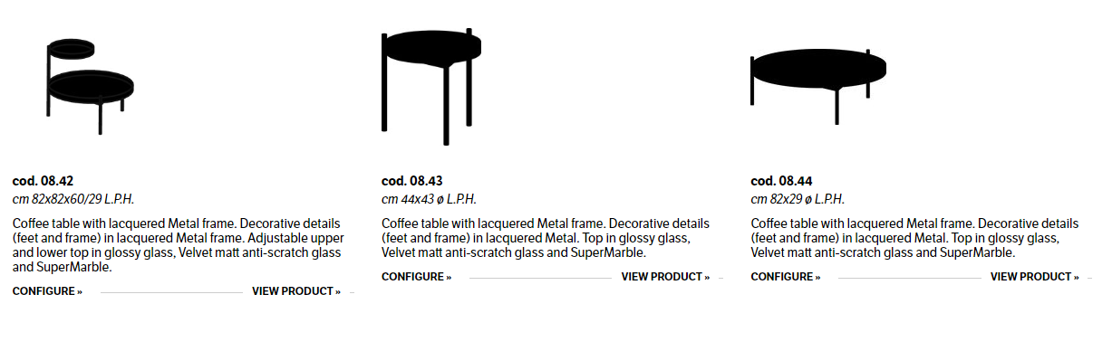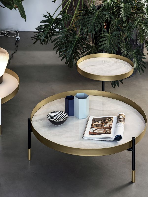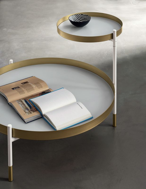 Coffee table with two adjustable tops and one top coffee table with lacquered Metal frame. Decorative details (feet and frame) in lacquered Metal. Tops in glossy glass, Velvet matt anti-scratch glass and SuperMarble.