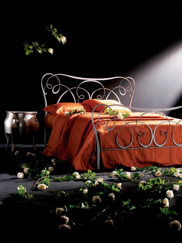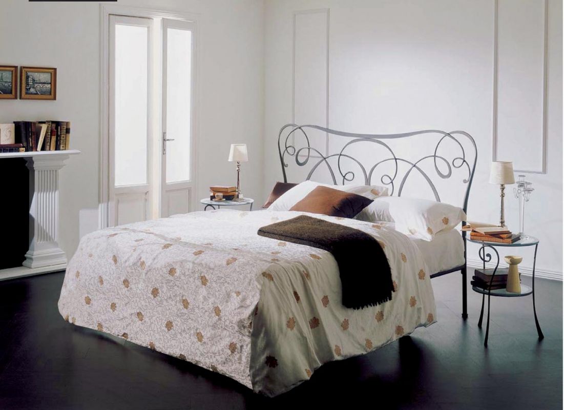Iron bed in lacquered or hand-coated metal frame, in double version, with footboard, bed ring or storage unit.