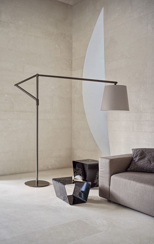 Floor lamp with with frame and base in lacquered metal and adjustable arm in lacquered aluminium. Lampshade in fabric.