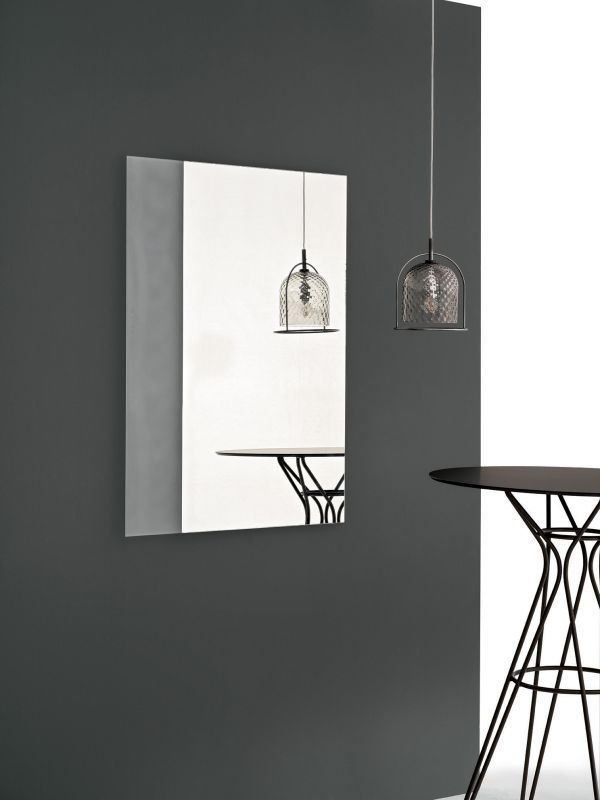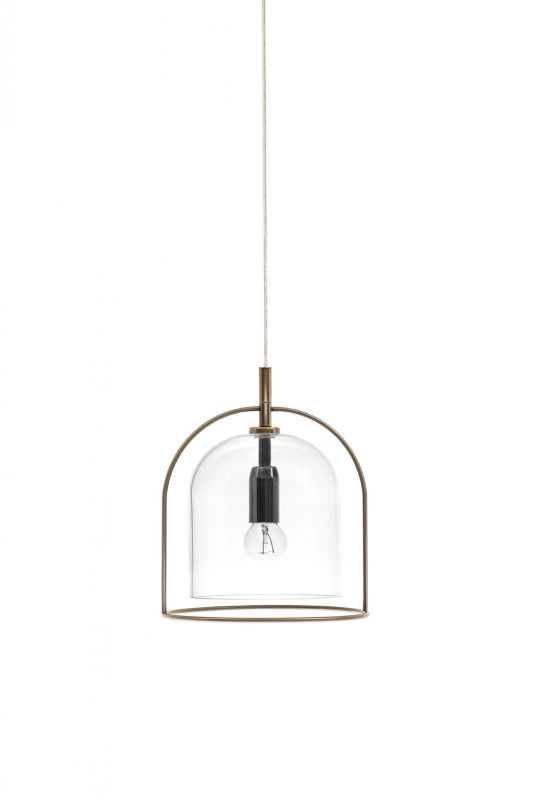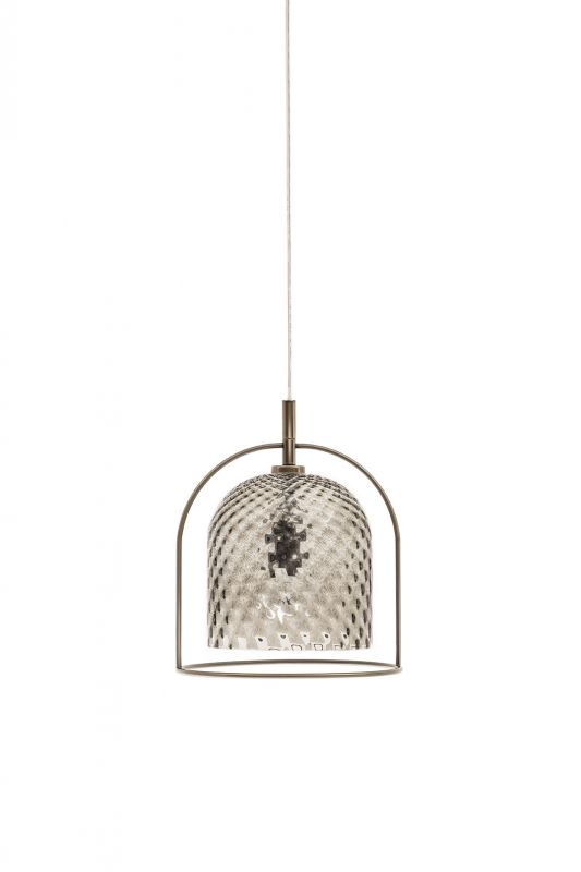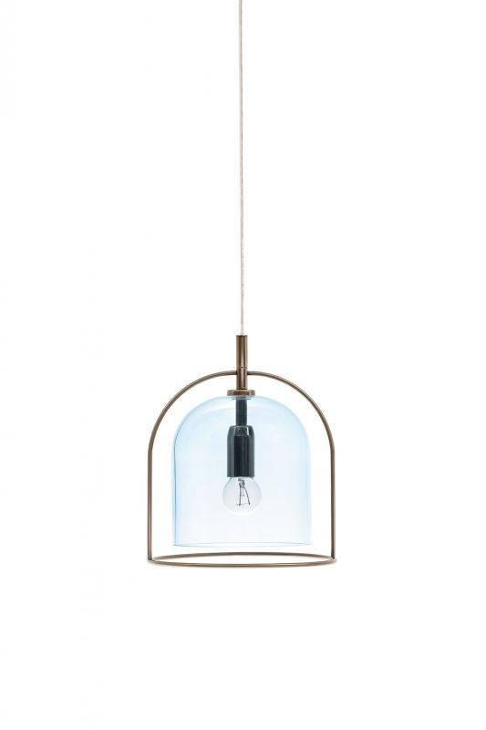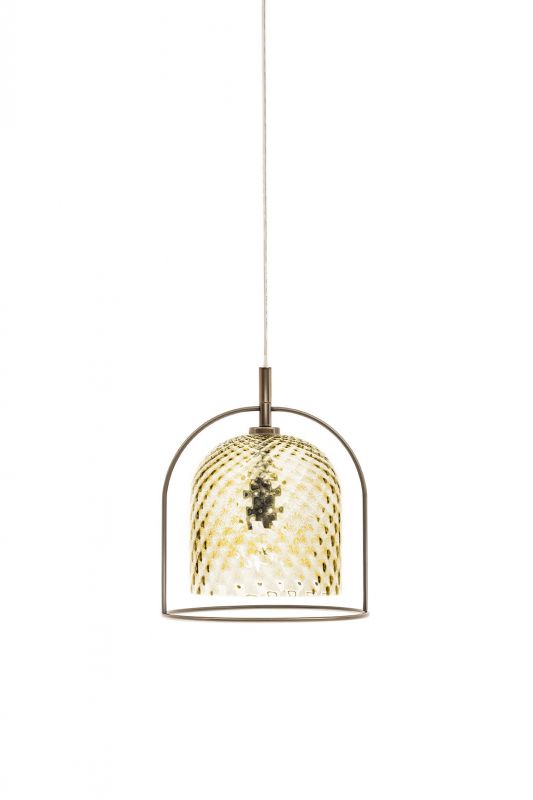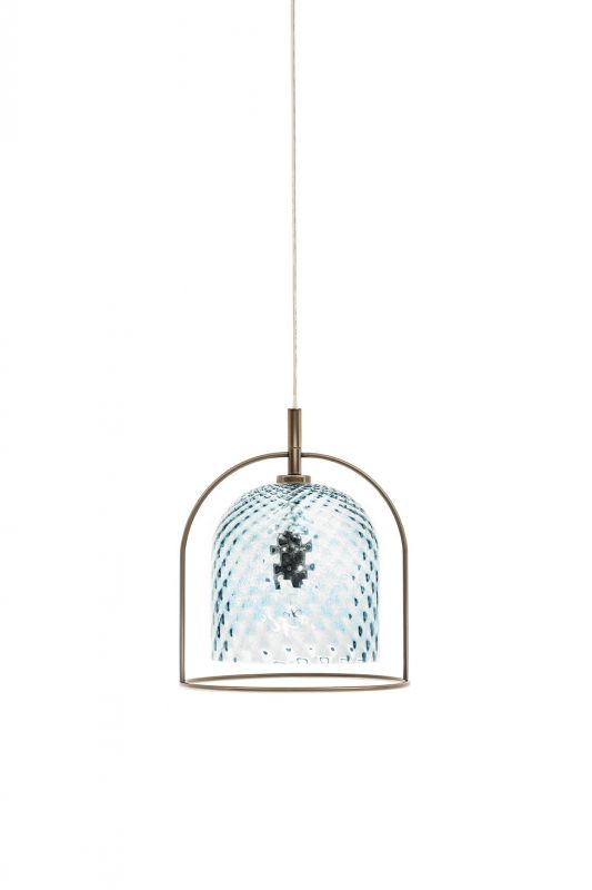 Ceiling light with chromed celiling rose and transparent cable. Laquered metal frame. Hand floating glass.