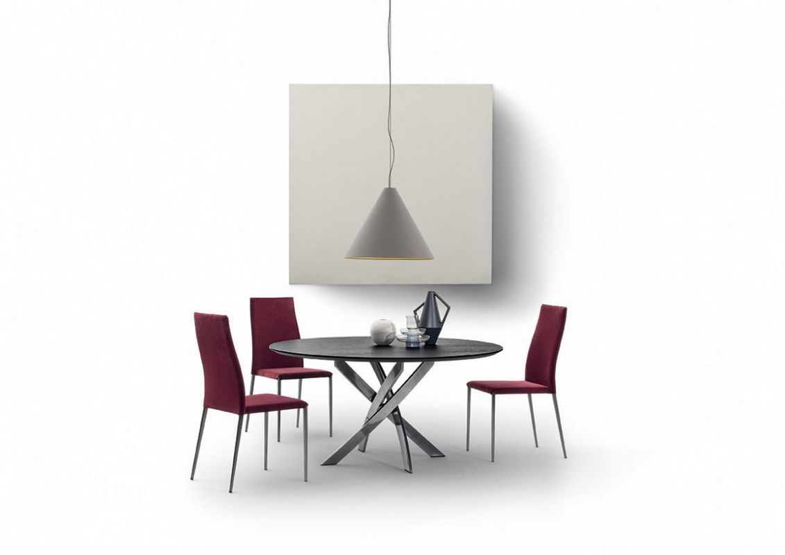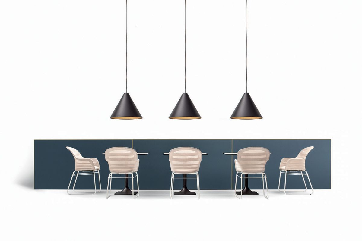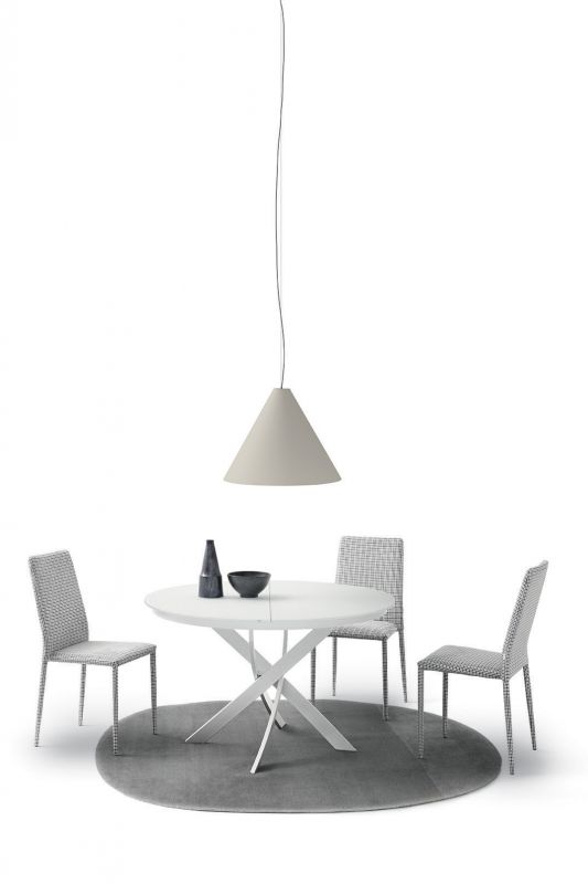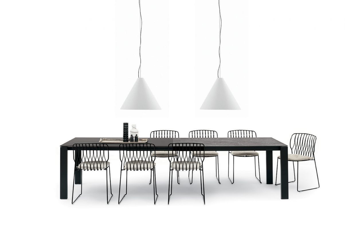 Program of ceiling lamps and floor lamps with metal lacquered frame and fabric lampshade.