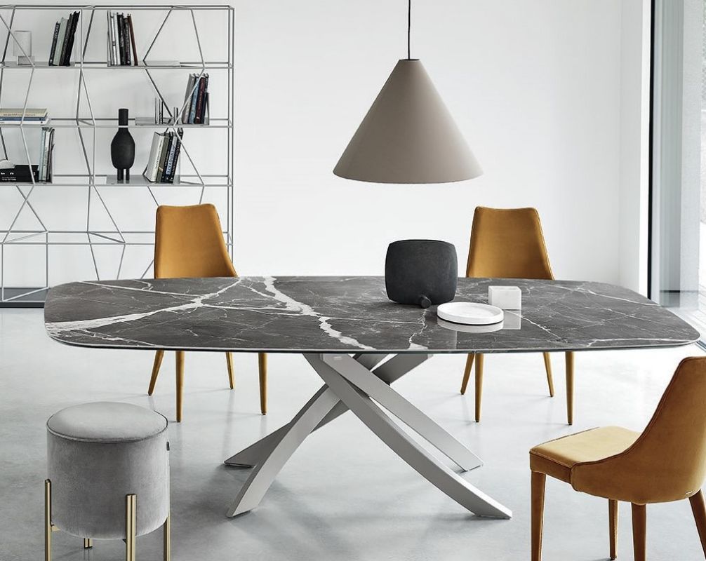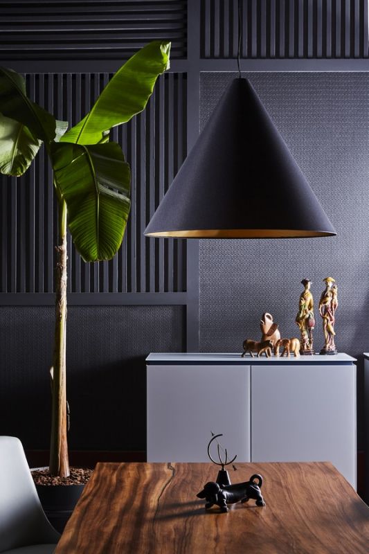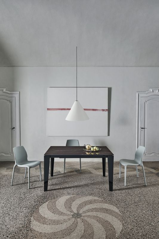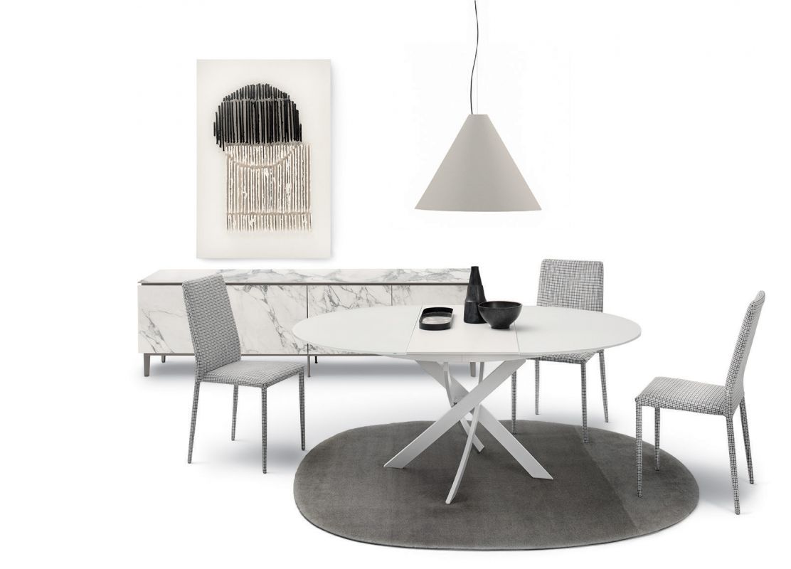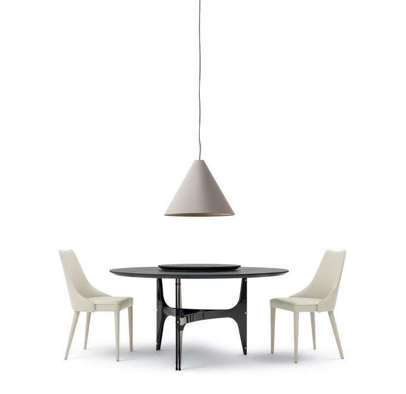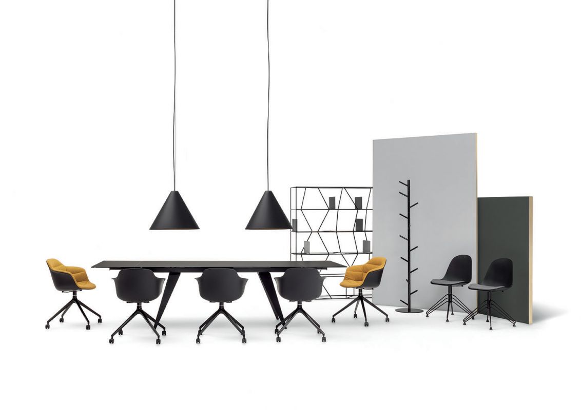 Program of ceiling lamps and floor lamps with metal lacquered frame and fabric lampshade.