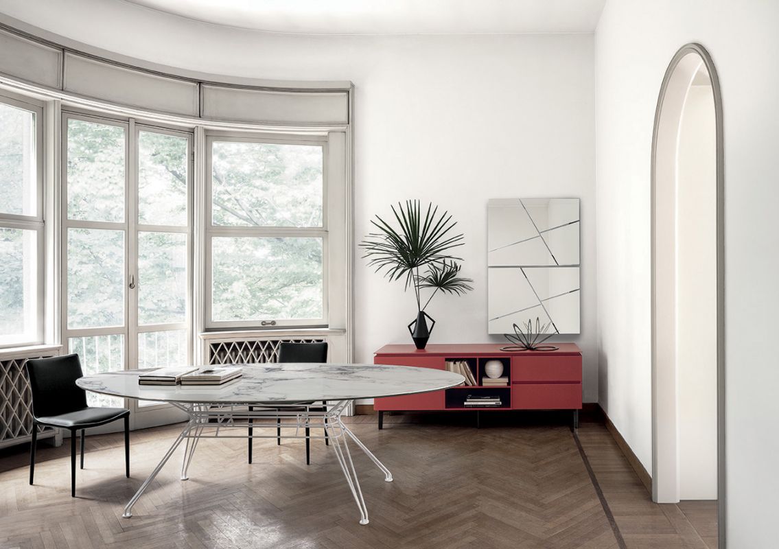 Wooden storage unit available with doors, drawers, baskets or open spaces. Groove opening system. Inside shelves in clear Glass. Top, frontal and side panels in glossy Glass and velvet matt Anti-scratch Glass.