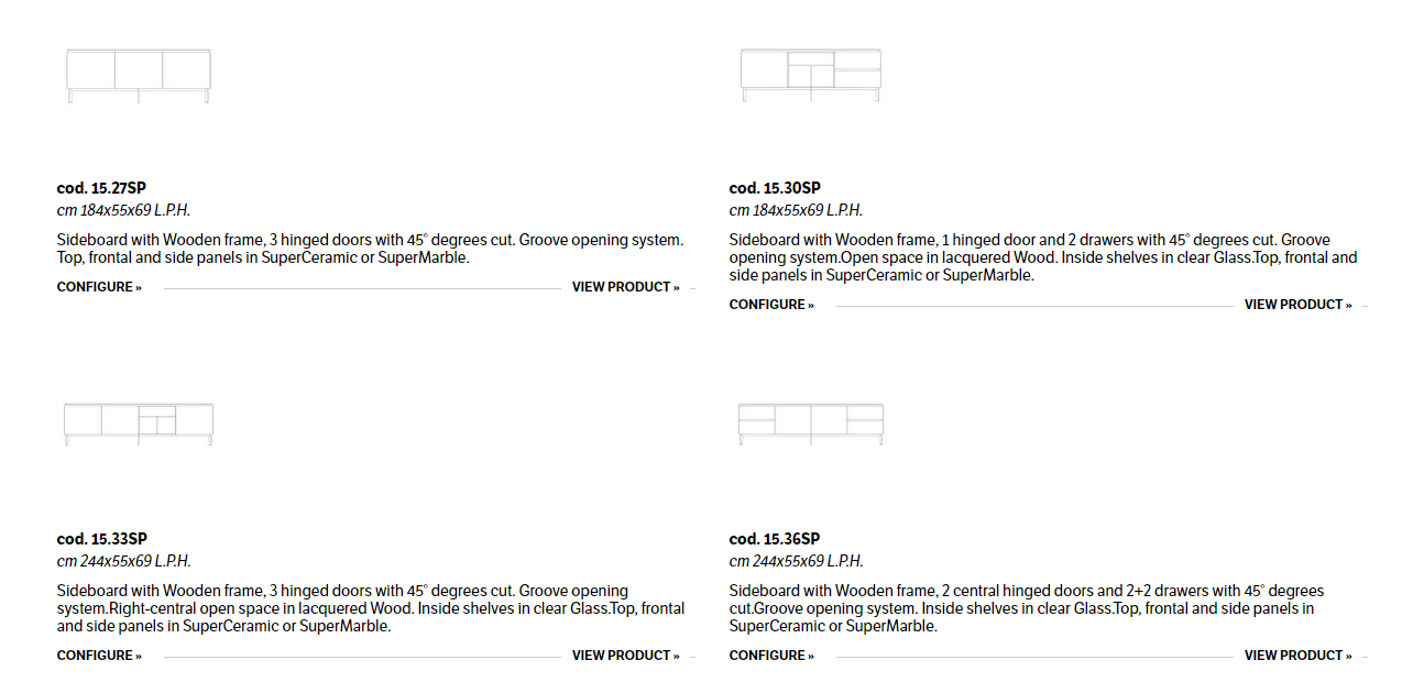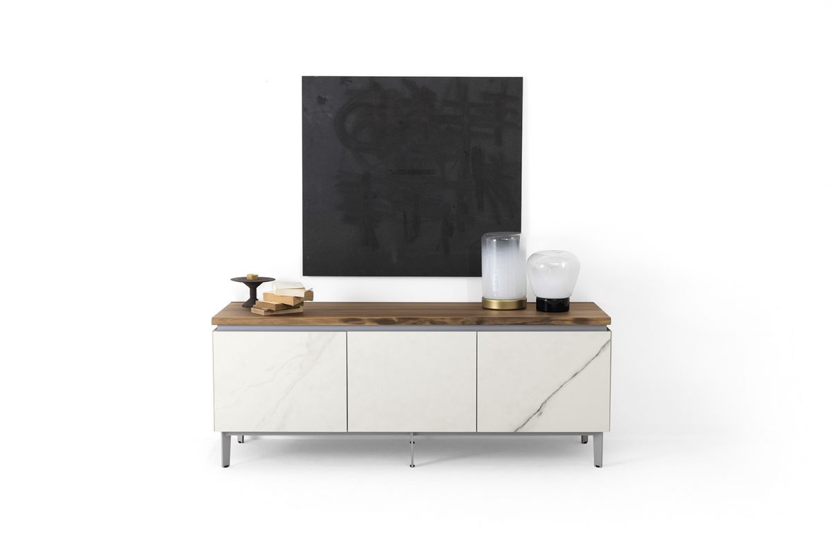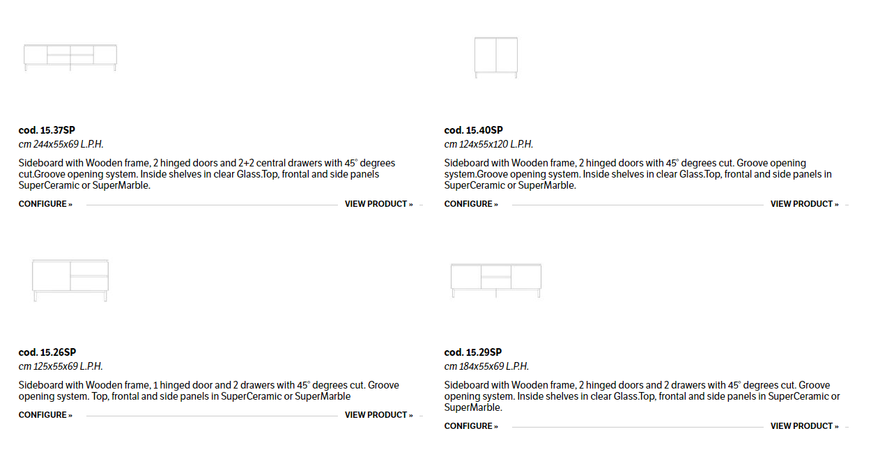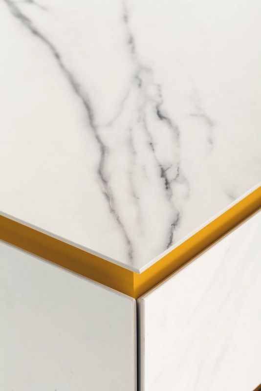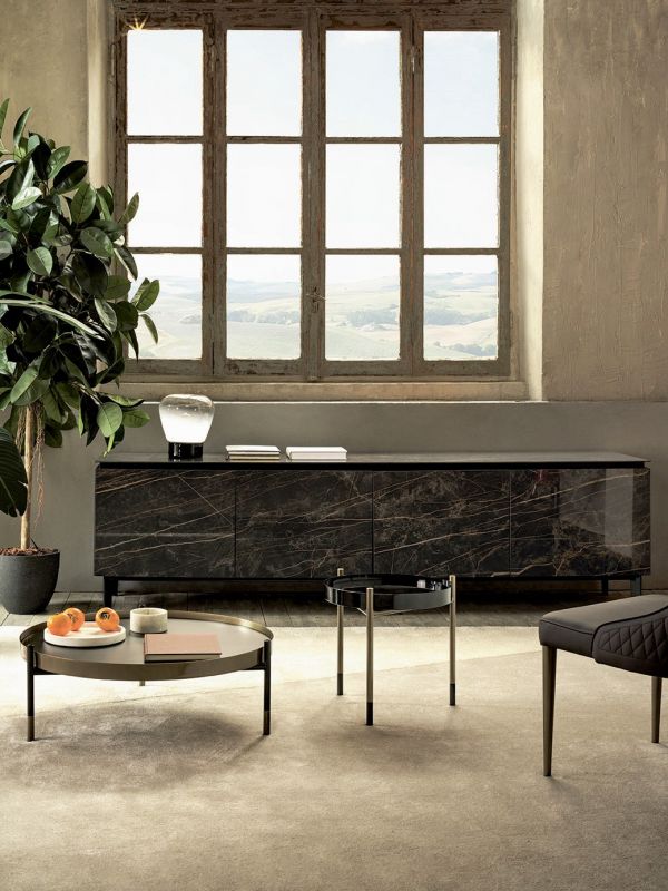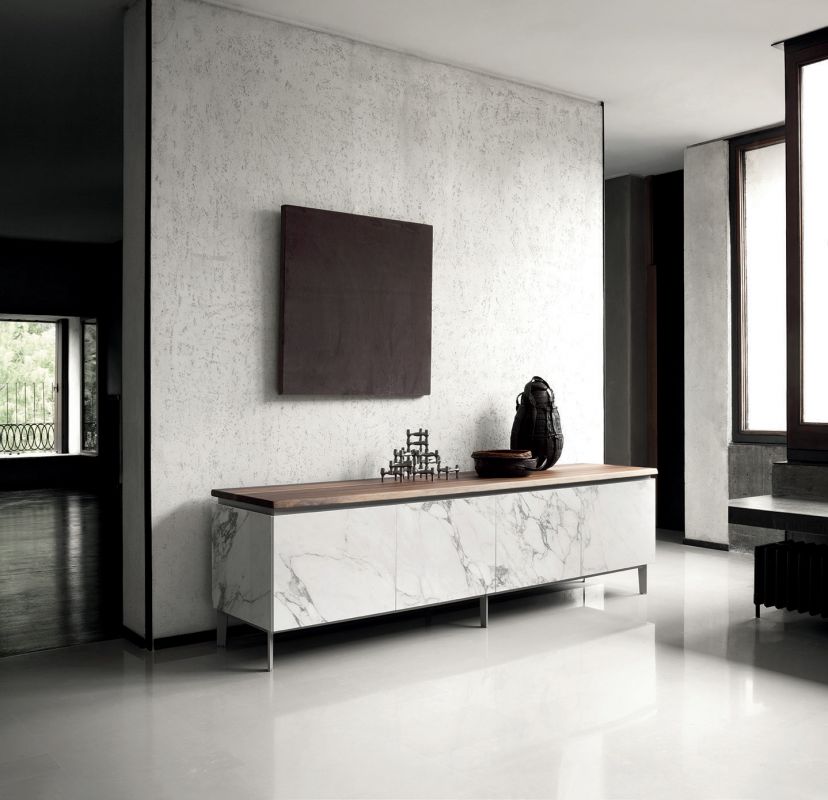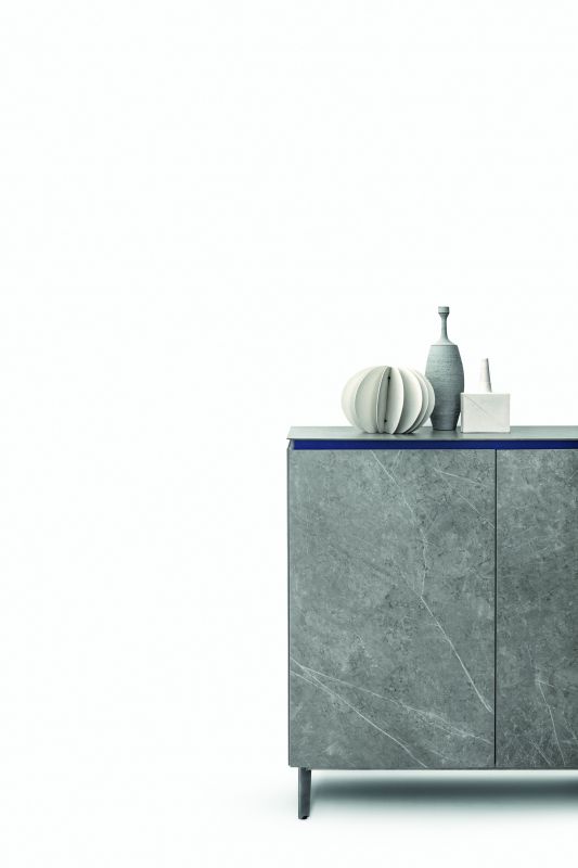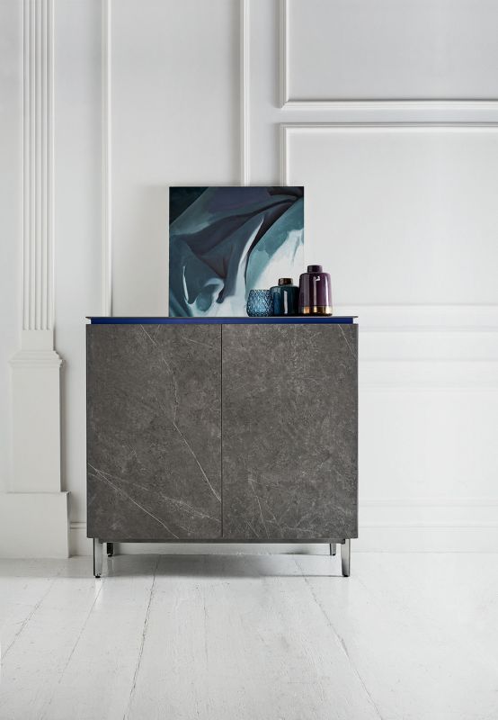 Wooden storage unit available with doors, drawers, baskets or open spaces. Groove opening system. Inside shelves in clear Glass. Top, frontal and side panels in SuperCeramic or SuperMarble.