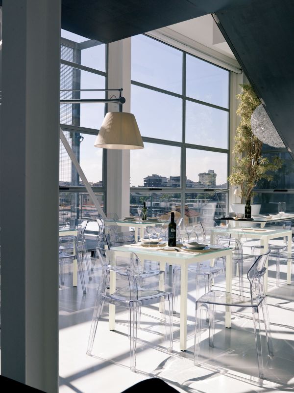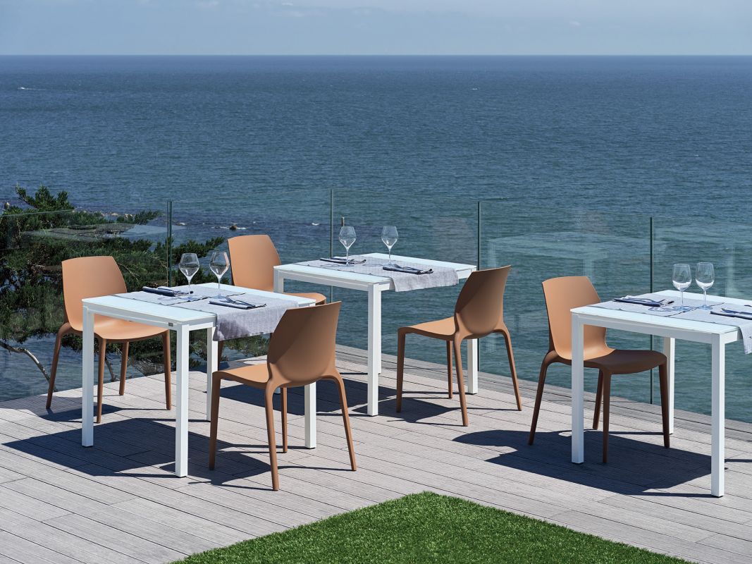 Fixed table with outdoor lacquered metal frame. Top in glossy glass or velvet matt anti-scratch glass.