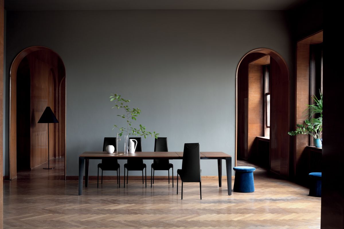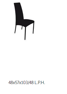 Chair with lacquered or chrome Metal frame. Seat and back padded and upholstered in Eco Leather, Technical velvet, Mambo and Lulù fabric, Technical velvet, Waterproof Nabuk, Waterproof printed Nabuk, Pure Virgin Wool, Velvet, Decò fabric and Premium Nappa Leather.