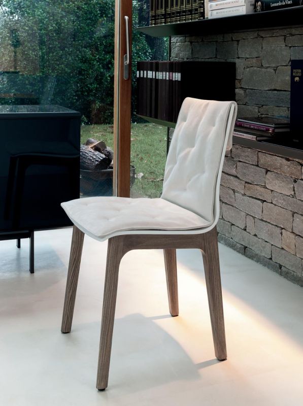 Chair with solid Wood or Metal frame. Shell in lacquered Wood with or without cushion quilted and upholstered.