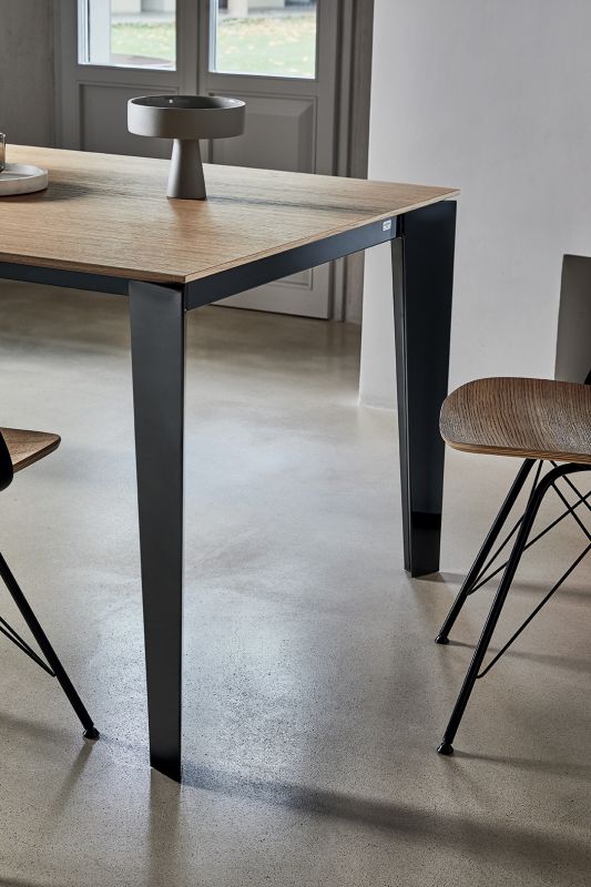 Table with extensions and lacquered Metal frame. Top in melamine, laminate Fenix, Anti-scratch Unicolor, veneer, glossy Glass, velvet matt Anti-scratch Glass, SuperCeramic or SuperMarble