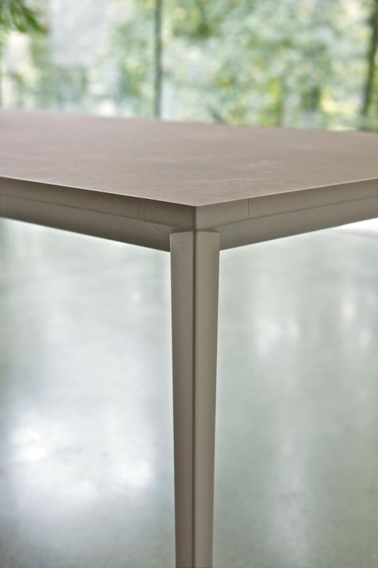 Extending table with stainless Metal frame. Top in melamine, laminate Fenix, Anti-scratch Unicolor, veneer, glossy Glass, velvet matt Anti-scratch Glass, SuperCeramic and SuperMarble.