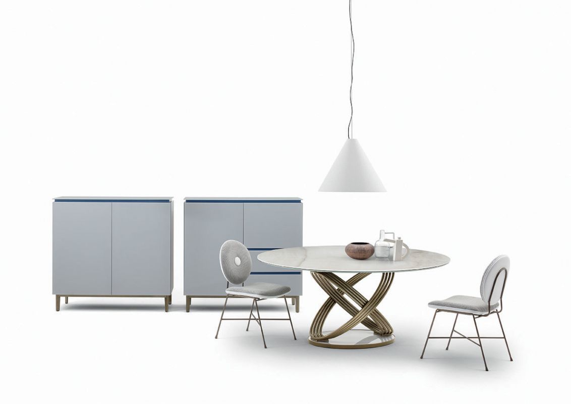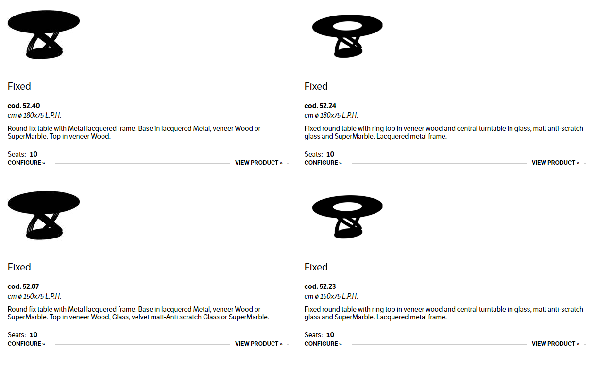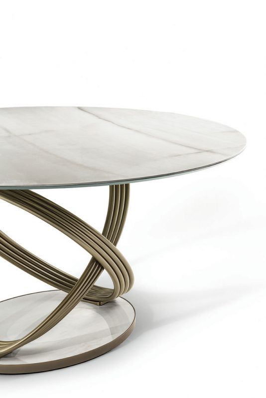 Round fix table with metal lacquered frame. Base in lacquered metal, veneer wood or SuperMarble. Top in veneer wood, glass, velvet matt-anti scratch glass or SuperMarble.