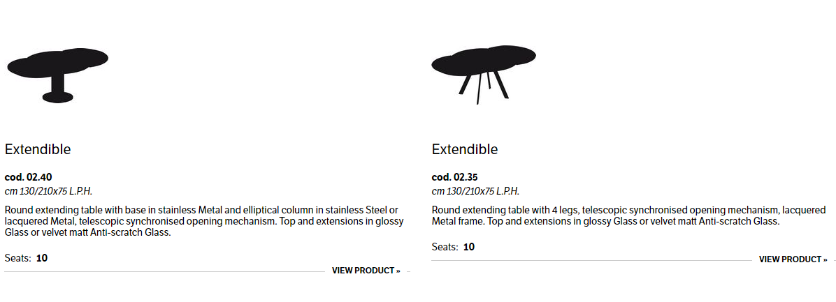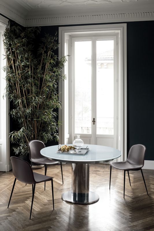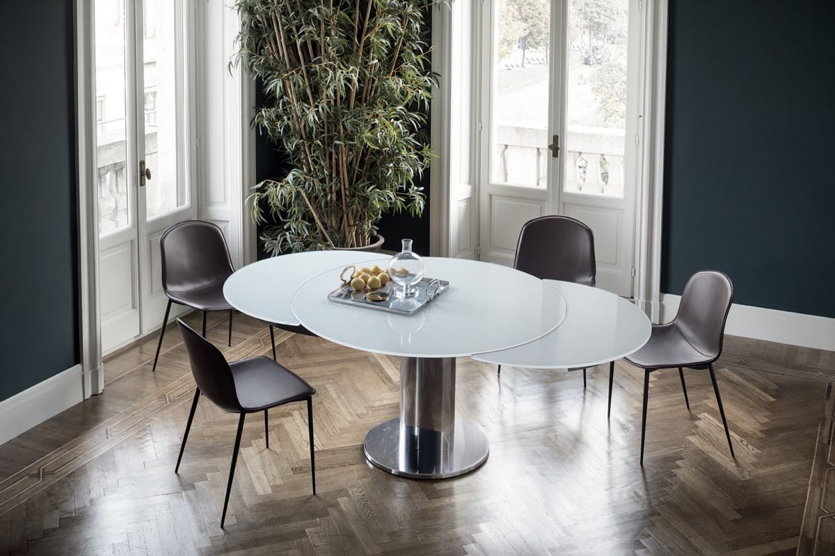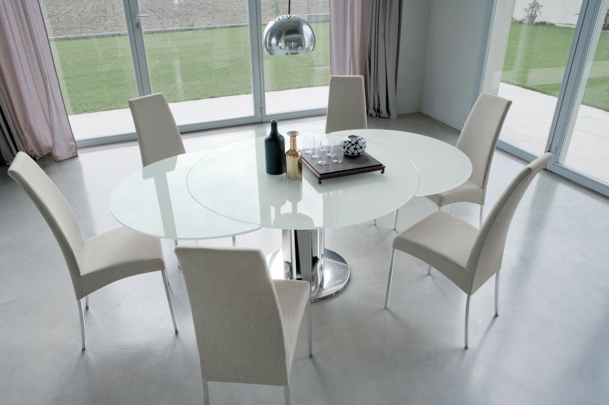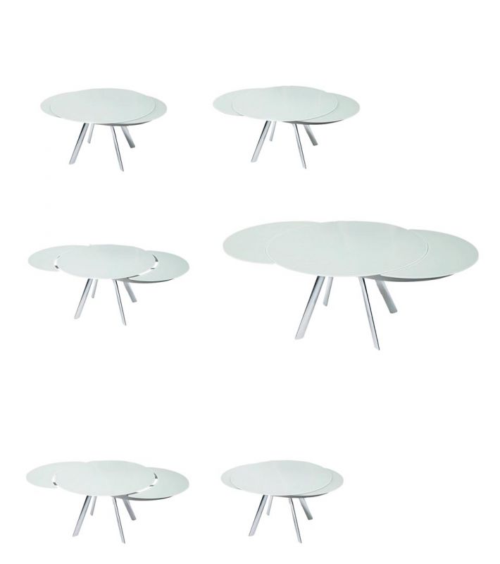 Round extending table, telescopic synchronised opening mechanism. Top and extensions in glossy Glass or velvet matt Anti-scratch Glass.